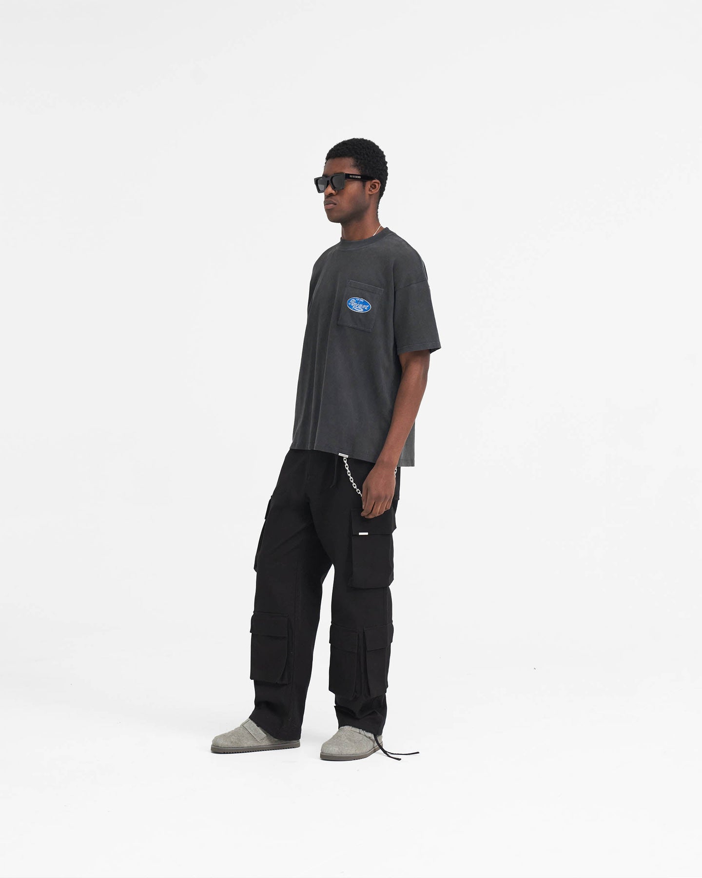 Introducing the Classic Parts T-Shirt in Aged Black, a t-shirt crafted from medium weight jersey cotton, with an oversized fit. It features our cracked Horizons motorsport inspired graphic to the front and back, and is finished with a Represent metal bar logo to the hem.