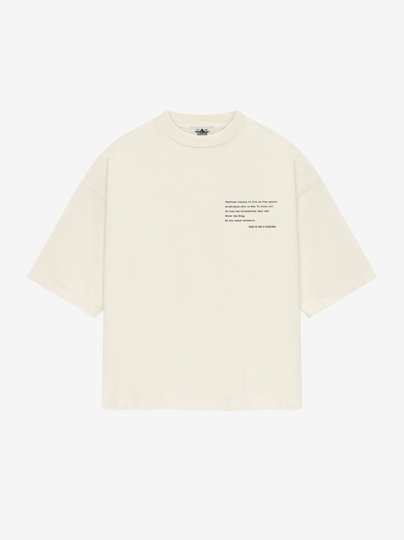 In honor of Malcolm X's 100th birthday, Fear of God has partnered with Barriers to create a limited-edition capsule collection. The short sleeve tee is made in the USA from 100% cotton jersey with hand-printed graphics to add visual impact to the front and back of the piece. This piece is designed with a relaxed fit with drop shoulders, and 3/4 sleeves. A Fear of God label is stitched at the back collar.