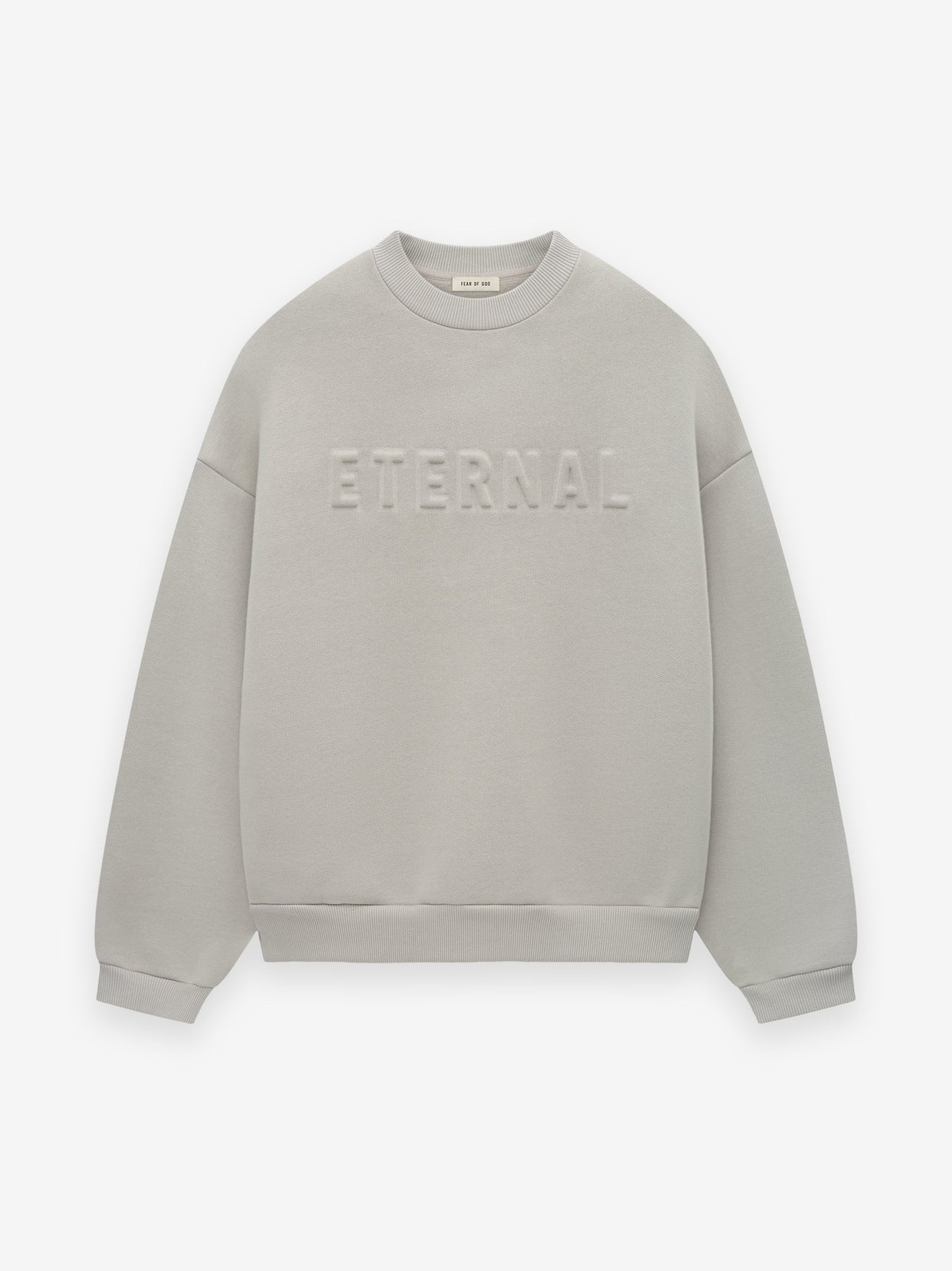The Eternal Crewneck is made in Portugal from a heavy cotton blend with an embossed "ETERNAL" logo on the front. The signature Fear of God fit is evident with a relaxed silhouette, dropped shoulders,  rib-knit cuffs and waist hem. Additional details include side pockets, and a Fear of God label is stitched on the hood.