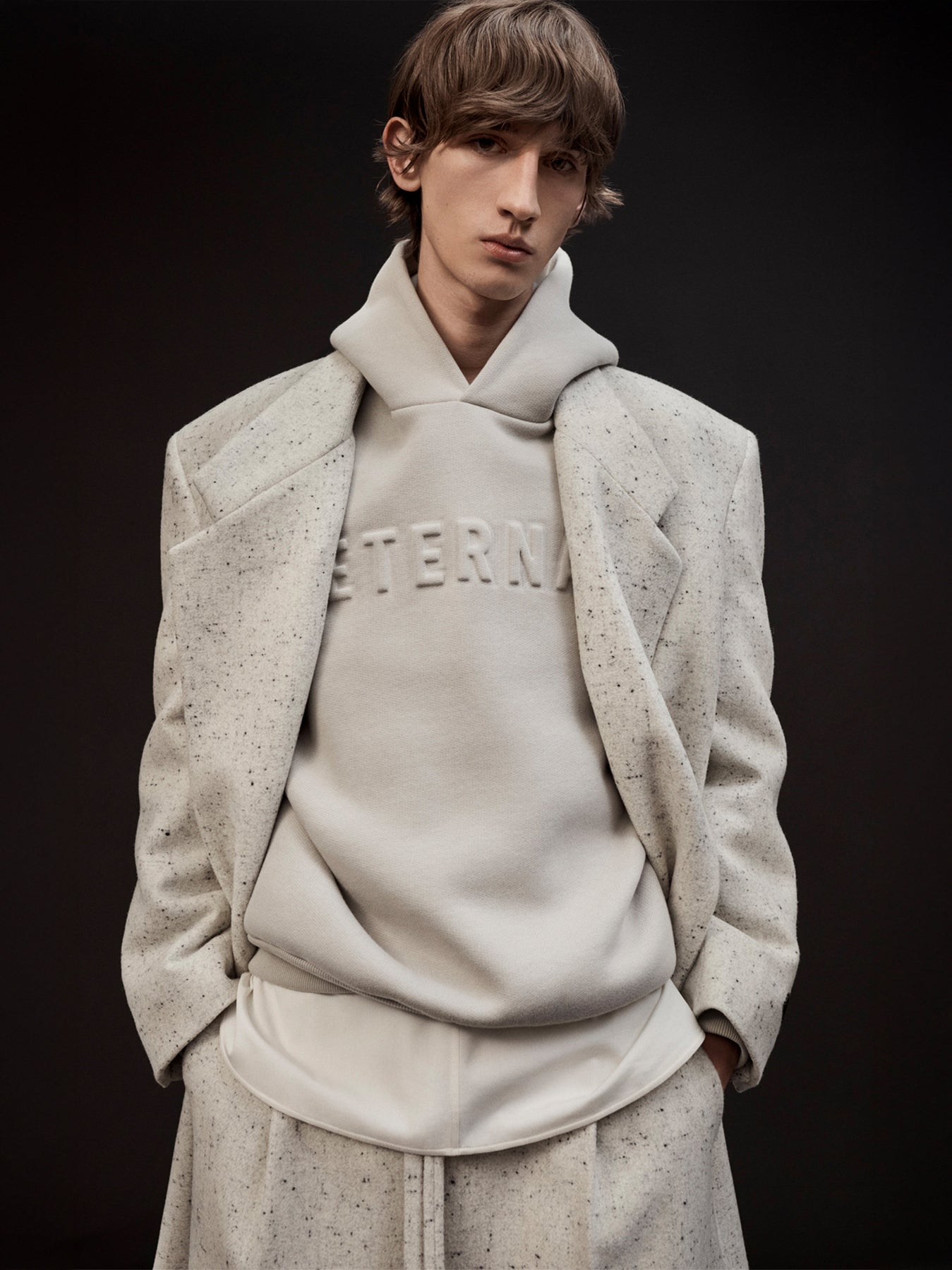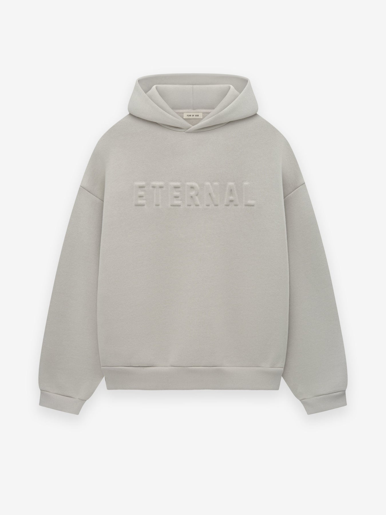 The Eternal Hoodie is made in Portugal from a heavy cotton blend with an embossed "ETERNAL" logo on the front. The signature Fear of God fit is evident with a relaxed silhouette, dropped shoulders, double-layered hood,  rib-knit cuffs and waist hem. Additional details include side pockets, and a Fear of God label is stitched on the hood.