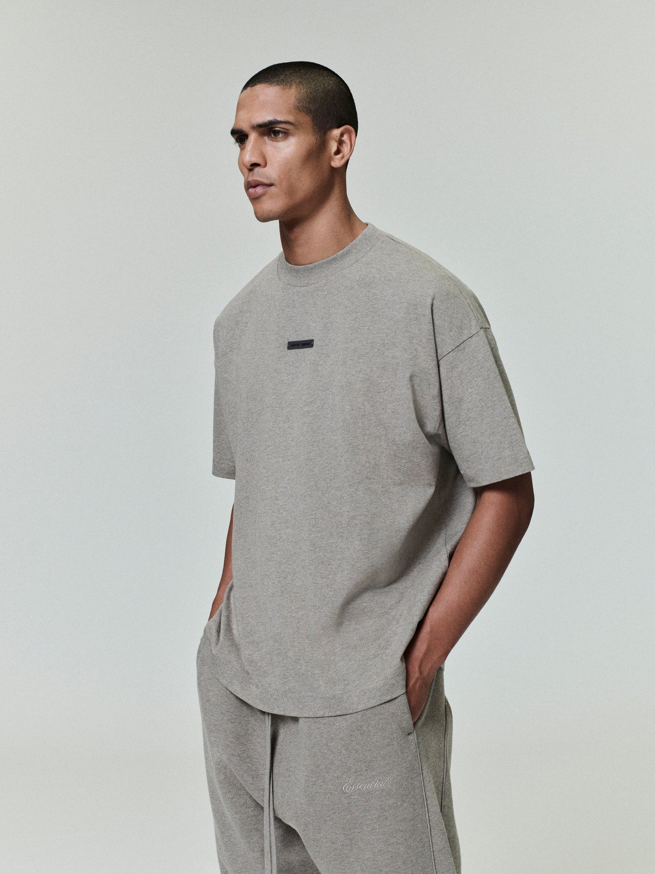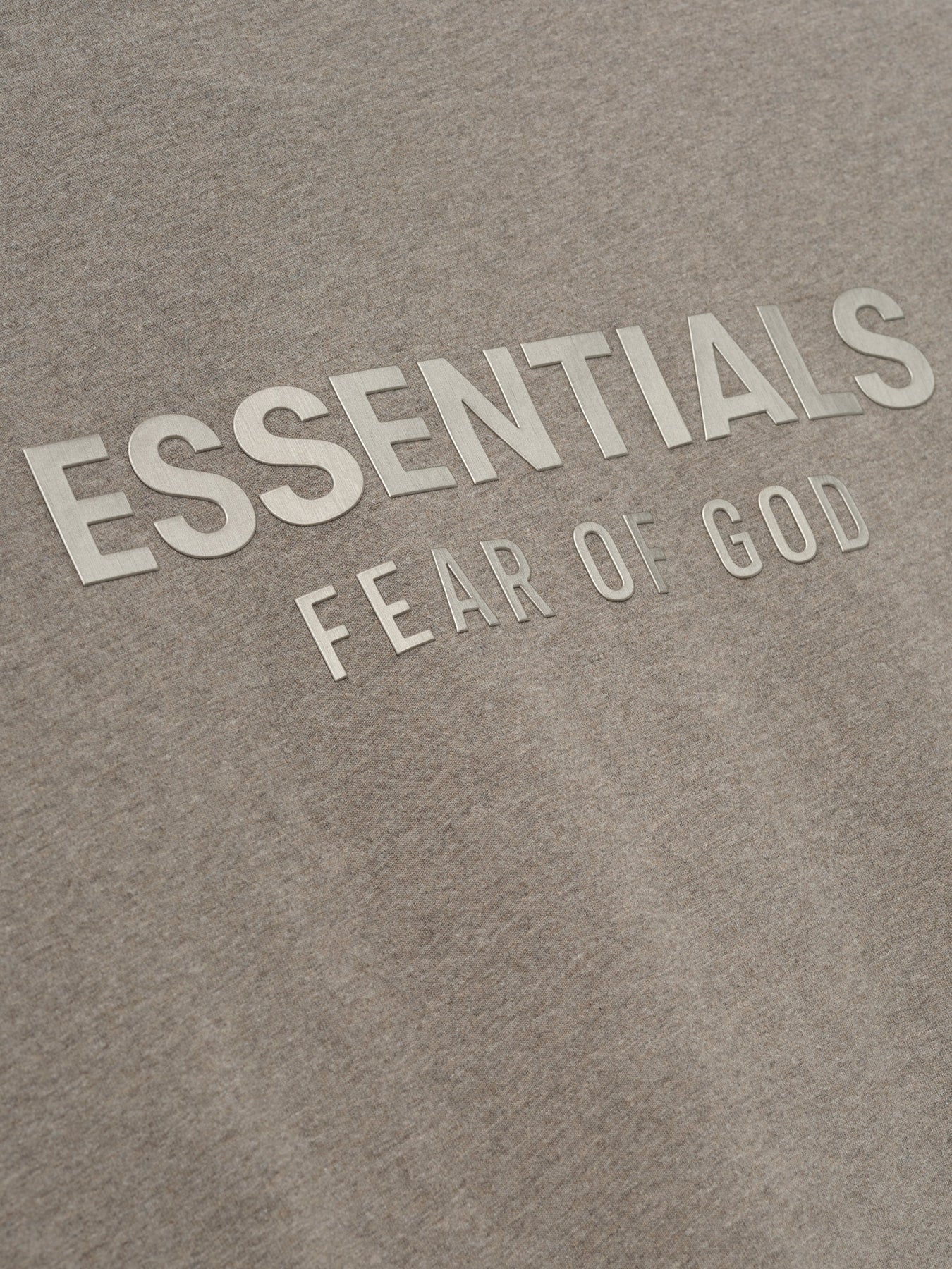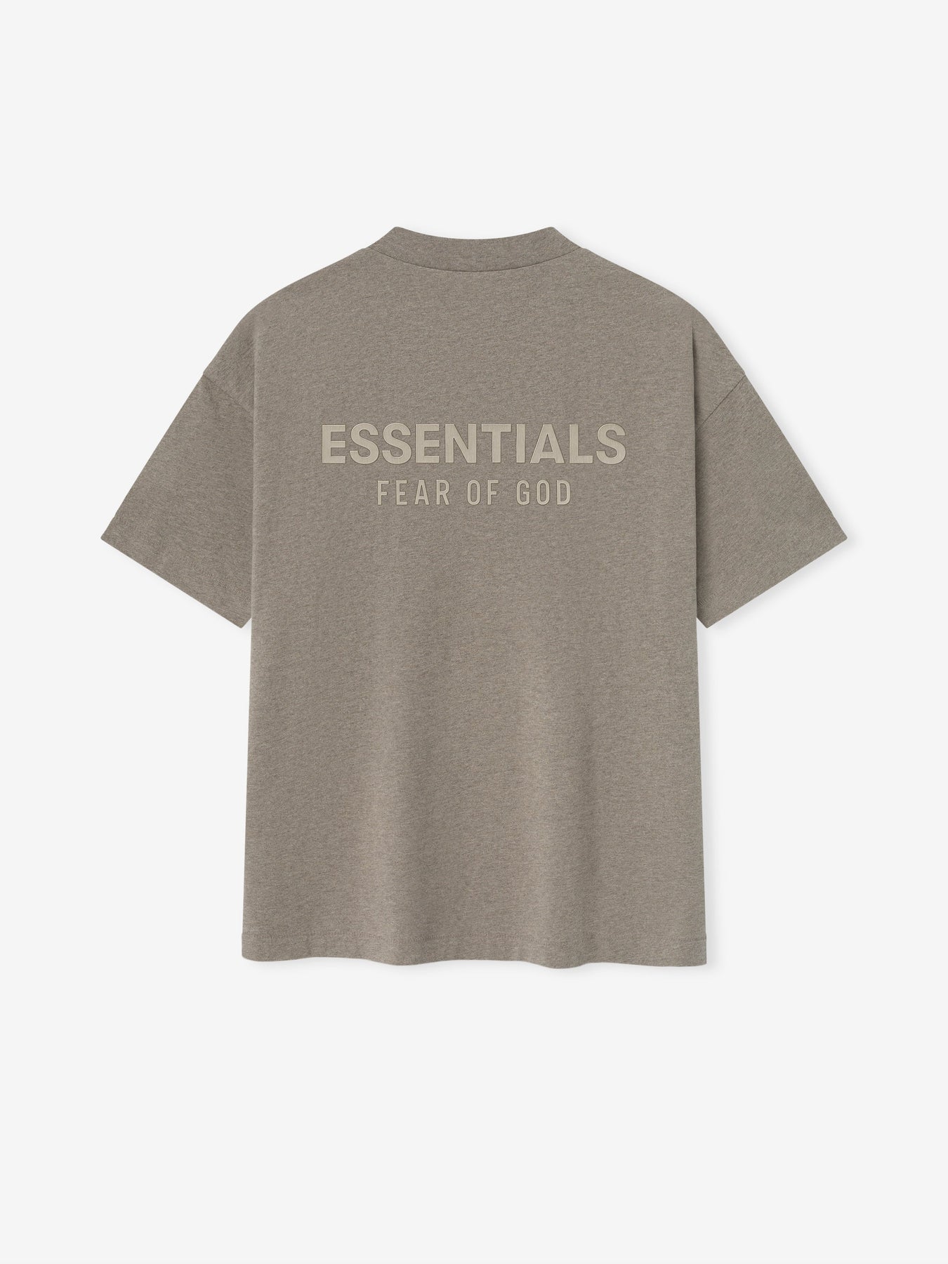 The Classic Tee is made from medium-weight 100% cotton jersey. The rib-knit crewneck tee features a classic fit with signature Fear of God relaxed proportions for everyday wear. Branding includes a "Fear of God Essentials" translucent rubberized label at the center front and a new "Essentials Fear of God" beveled metallic logo across the back.