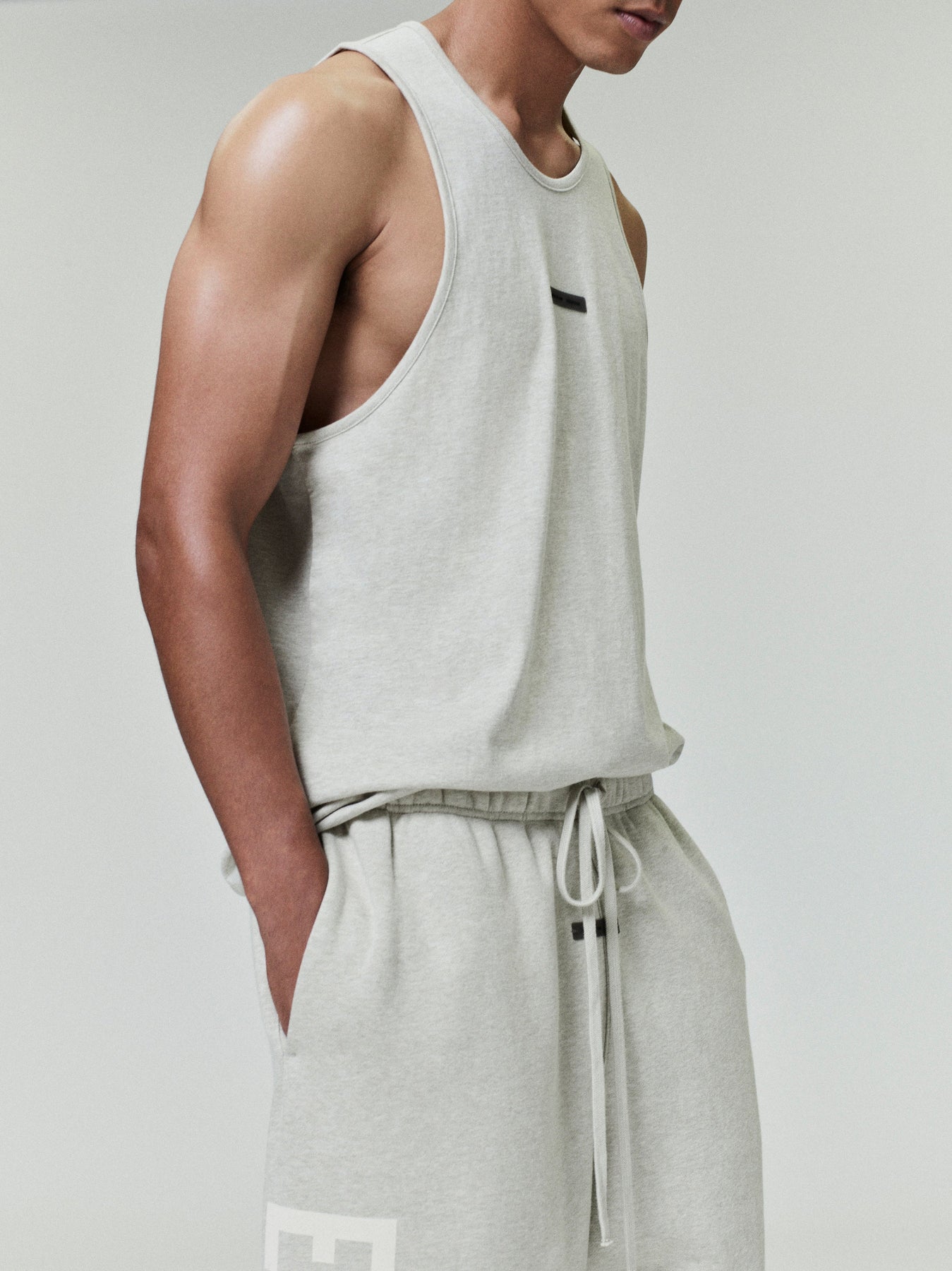The Lightweight Essential Tank is crafted from lightweight 100% cotton jersey. The U-neck tank features a vintage fit for a slimmer silhouette with longer length. Branding includes a "Fear of God Essentials" rubberized label at the center front and the "Essentials Fear of God" logo at the back collar.