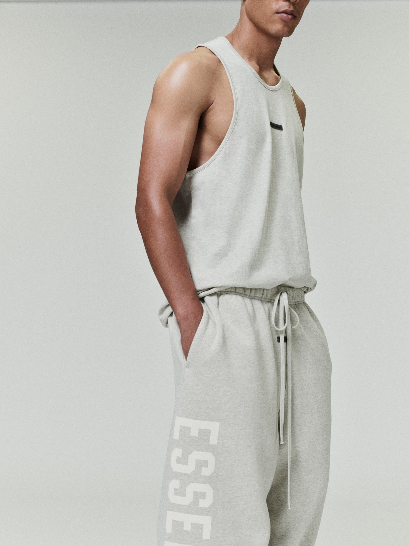 The Light Essential Tank is crafted from lightweight 100% cotton jersey. The U-neck tank features a vintage fit for a slimmer silhouette with longer length. Branding includes a "Fear of God Essentials" rubberized label at the center front and the "Essentials Fear of God" logo at the back collar.