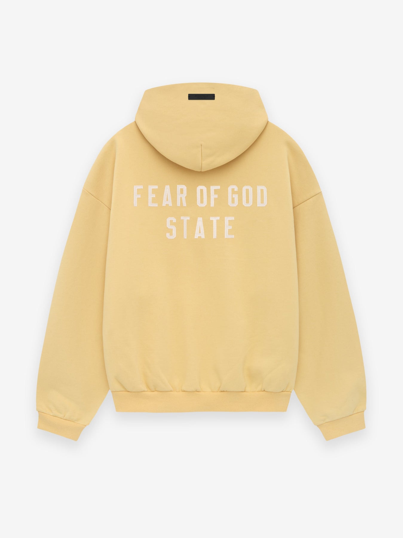 The Heavy Fleece Fullzip Hoodie is made from heavyweight 520gsm, 100% cotton fleece and given a subtle vintage wash. A collegiate-inspired "Fear of God State" satin twill lettering is stitched to the across the back. Details include an full-zip front, double-layered hood, rib-knit cuffs, waist-hem, and side pockets. The Essentials Fear of God rubberized label is stitched on the hood.
