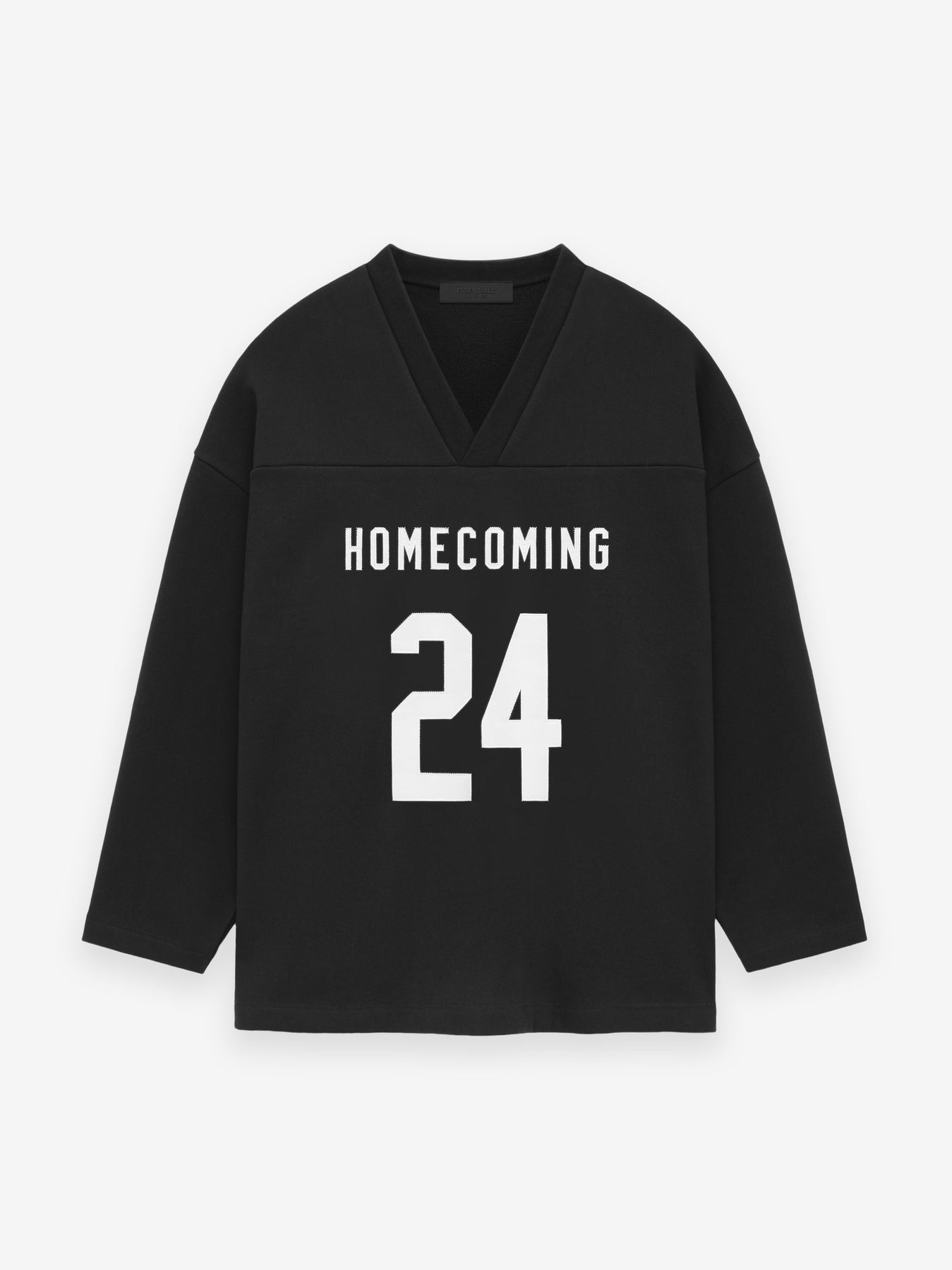 The Heavy Fleece Hockey Jersey is made from heavyweight 520gsm, 100% cotton fleece with a subtle vintage wash. The piece is designed in a hockey jersey-inspired silhouette. For an authentic sports lockup, a satin twill lettered "Homecoming" and "24" are stitched on the front. Additional details include a deep V-neck and the Essentials Fear of God rubberized label stitched at the back collar.