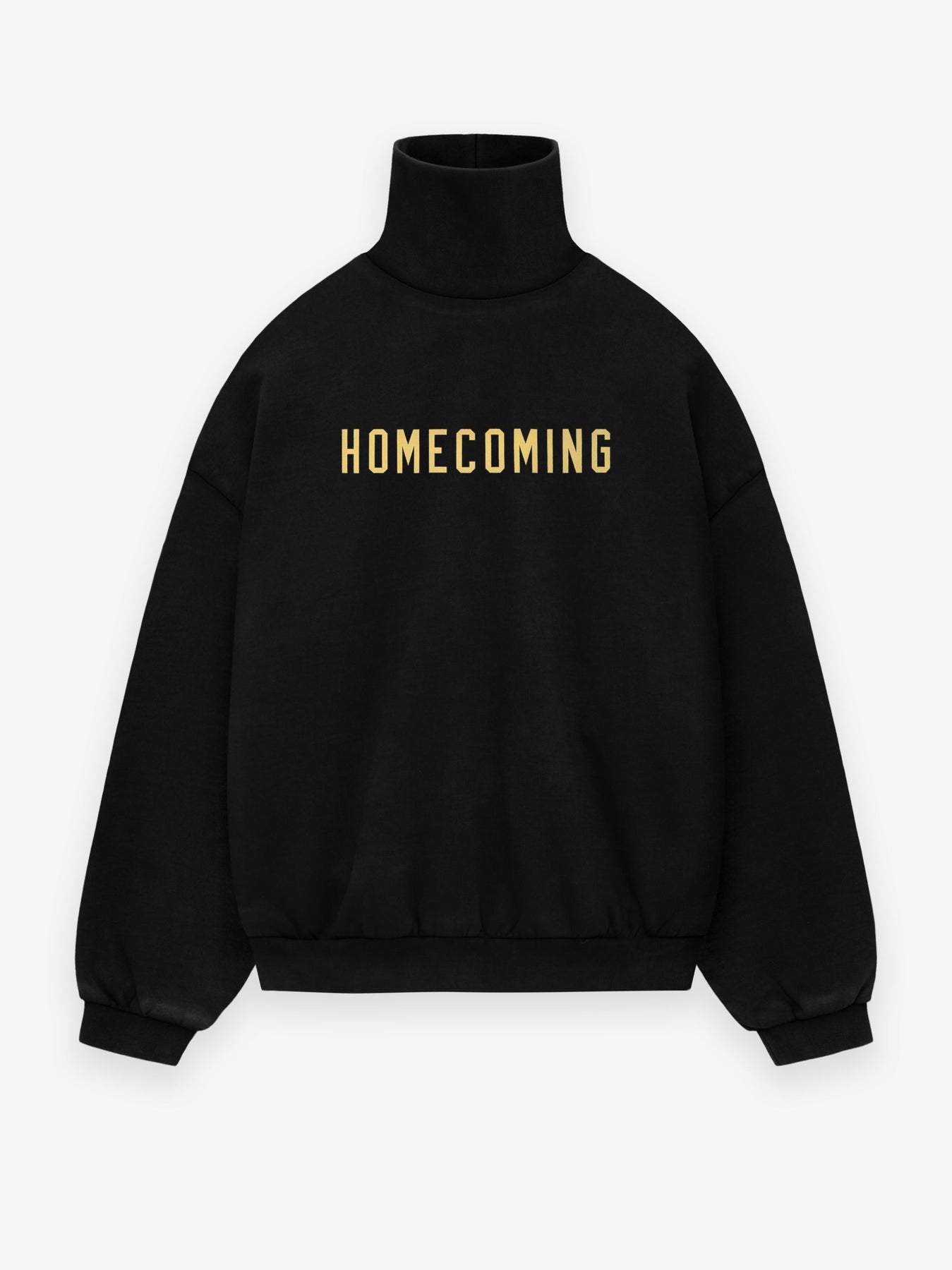 The Heavy Fleece Turtleneck is made from heavyweight 520gsm, 100% cotton fleece with a subtle vintage wash. A collegiate-inspired "Homecoming" graphic is screen-printed on the front. Details include a rib-knit turtleneck, cuffs, waist-hem, and side pockets. The Essentials Fear of God rubberized label is at the back collar.