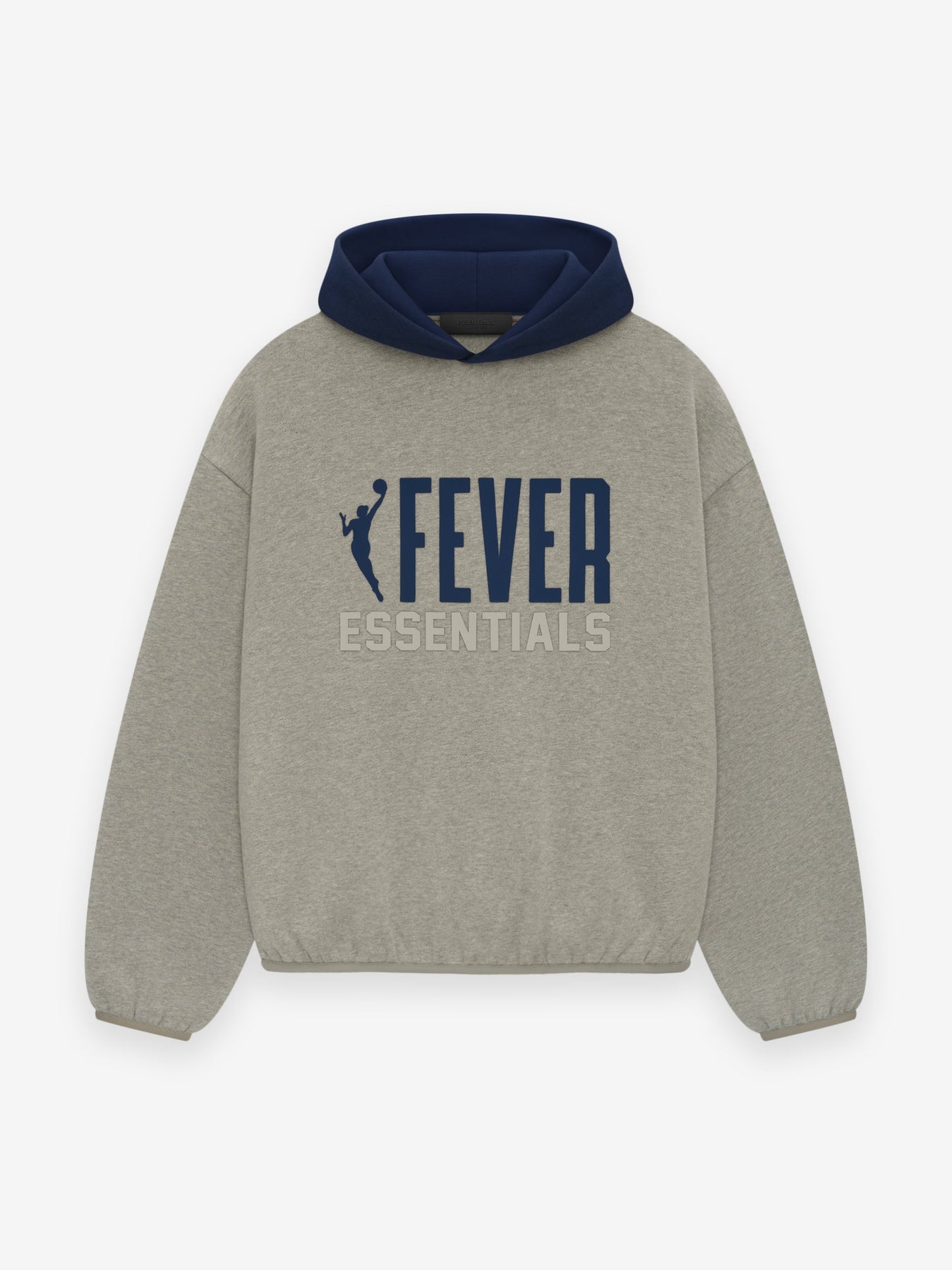 The Essentials Fever hoodie is crafted from core fleece and features a voluminous, cropped silhouette. The front displays a rubberized soft-touch Fever Essentials lockup along with the WNBA logo. Additional details include a contrasting double layered hood, side seam pockets, and elastic bindings at the cuffs and waist hem. A rubberized Fear of God label is attached to the hood.