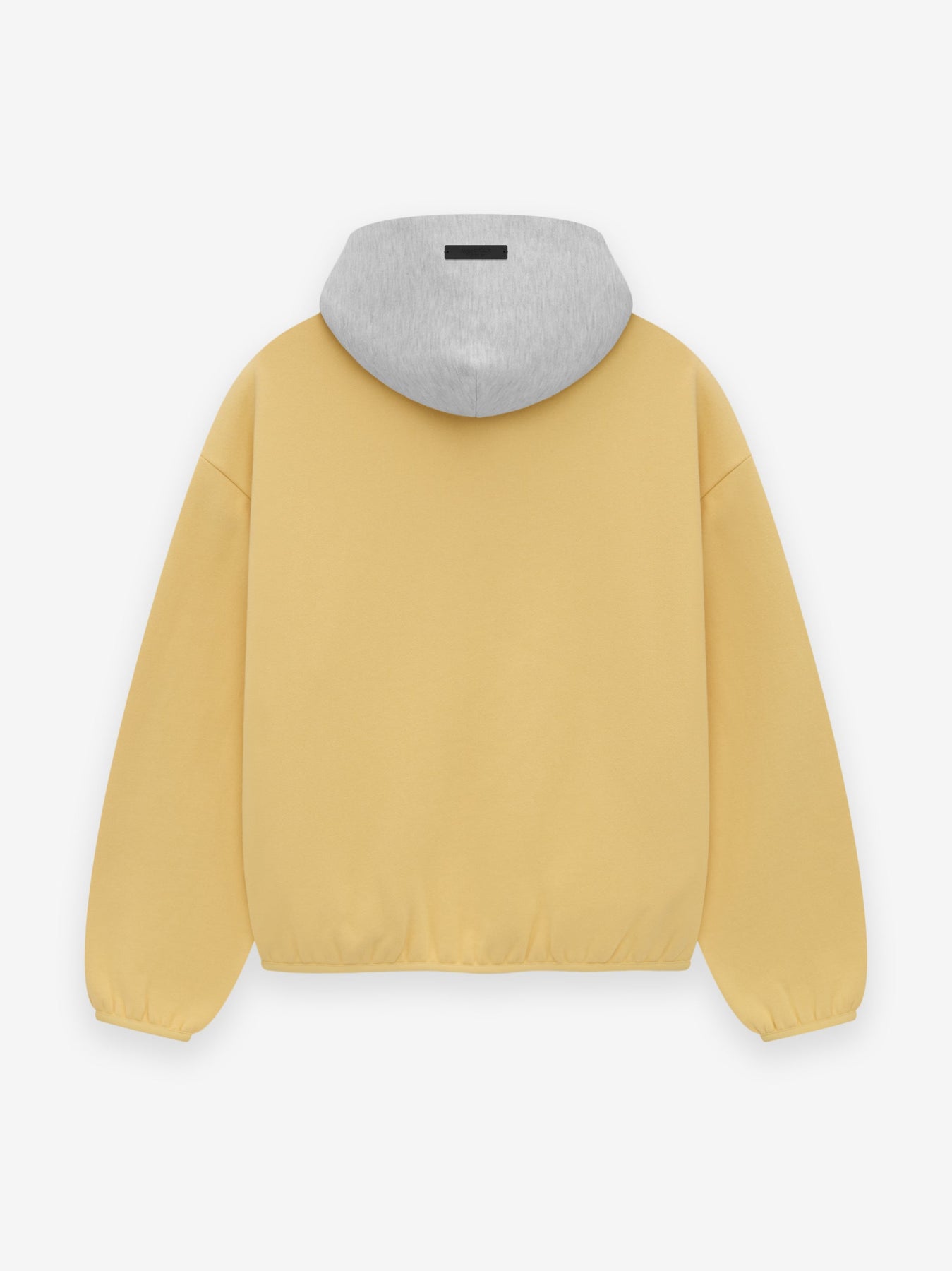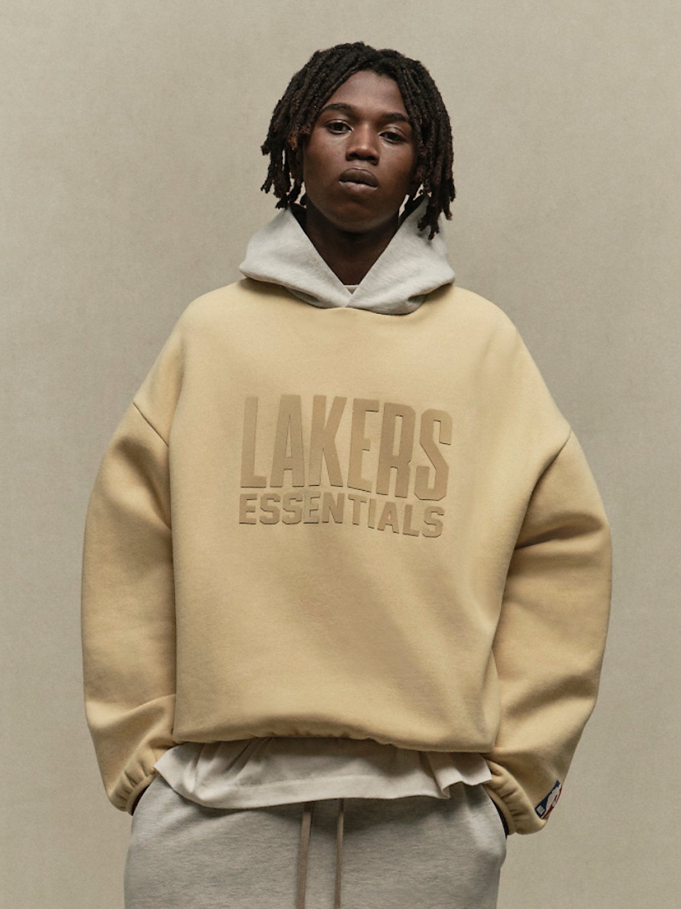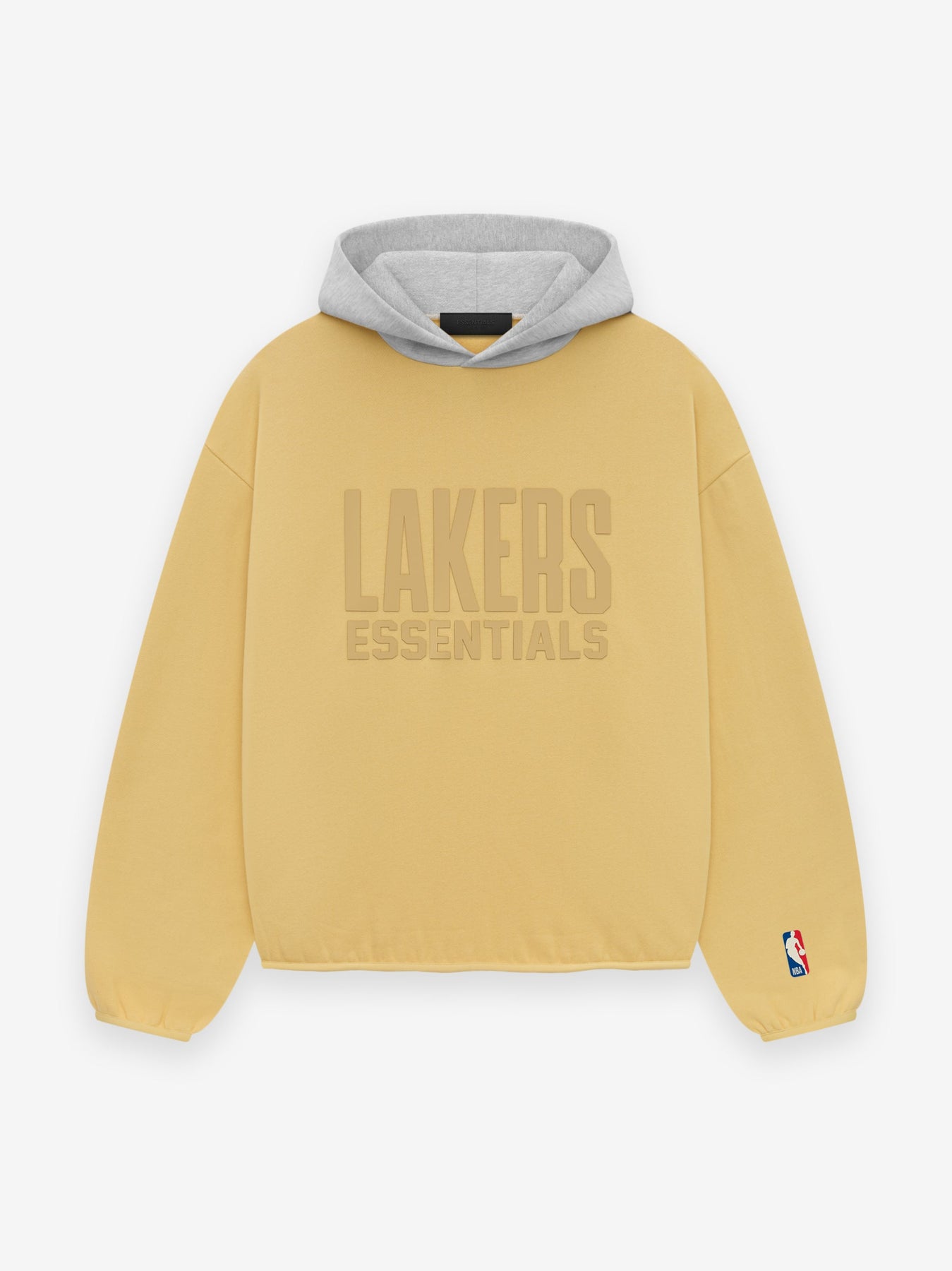 The Essentials Lakers hoodie is crafted from core fleece and features a voluminous, cropped silhouette. The front displays a rubberized soft-touch Lakers Essentials lockup along with the iconic NBA logo on the sleeve. Additional details include a contrasting double layered hood, side seam pockets, and elastic bindings at the cuffs and waist hem. A rubberized Fear of God label is attached to the hood.