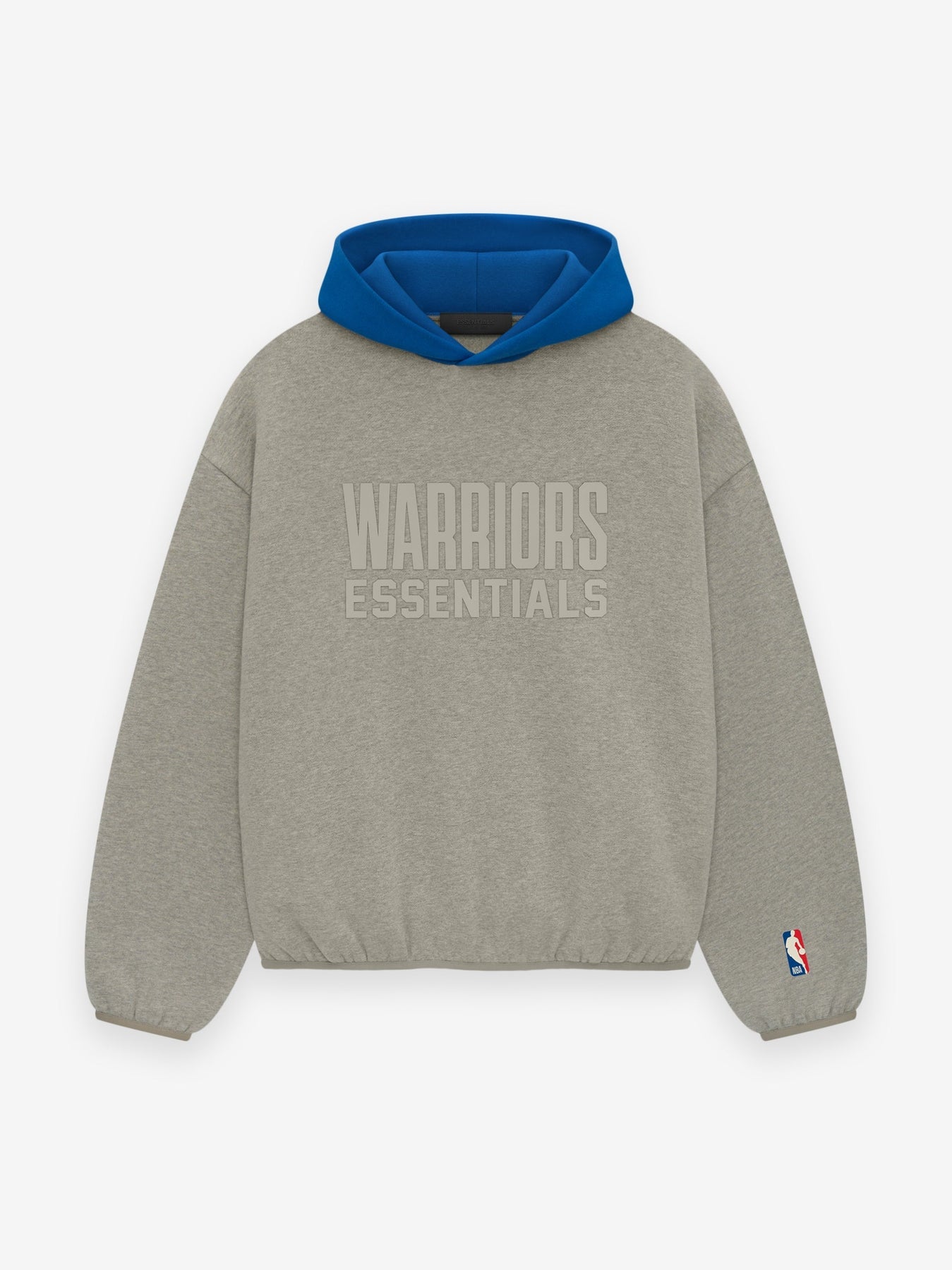 The Essentials Warriors hoodie is crafted from core fleece and features a voluminous, cropped silhouette. The front displays a rubberized soft-touch Warriors Essentials lockup along with the iconic NBA logo on the sleeve. Additional details include a contrasting double layered hood, side seam pockets, and elastic bindings at the cuffs and waist hem. A rubberized Fear of God label is attached to the hood.