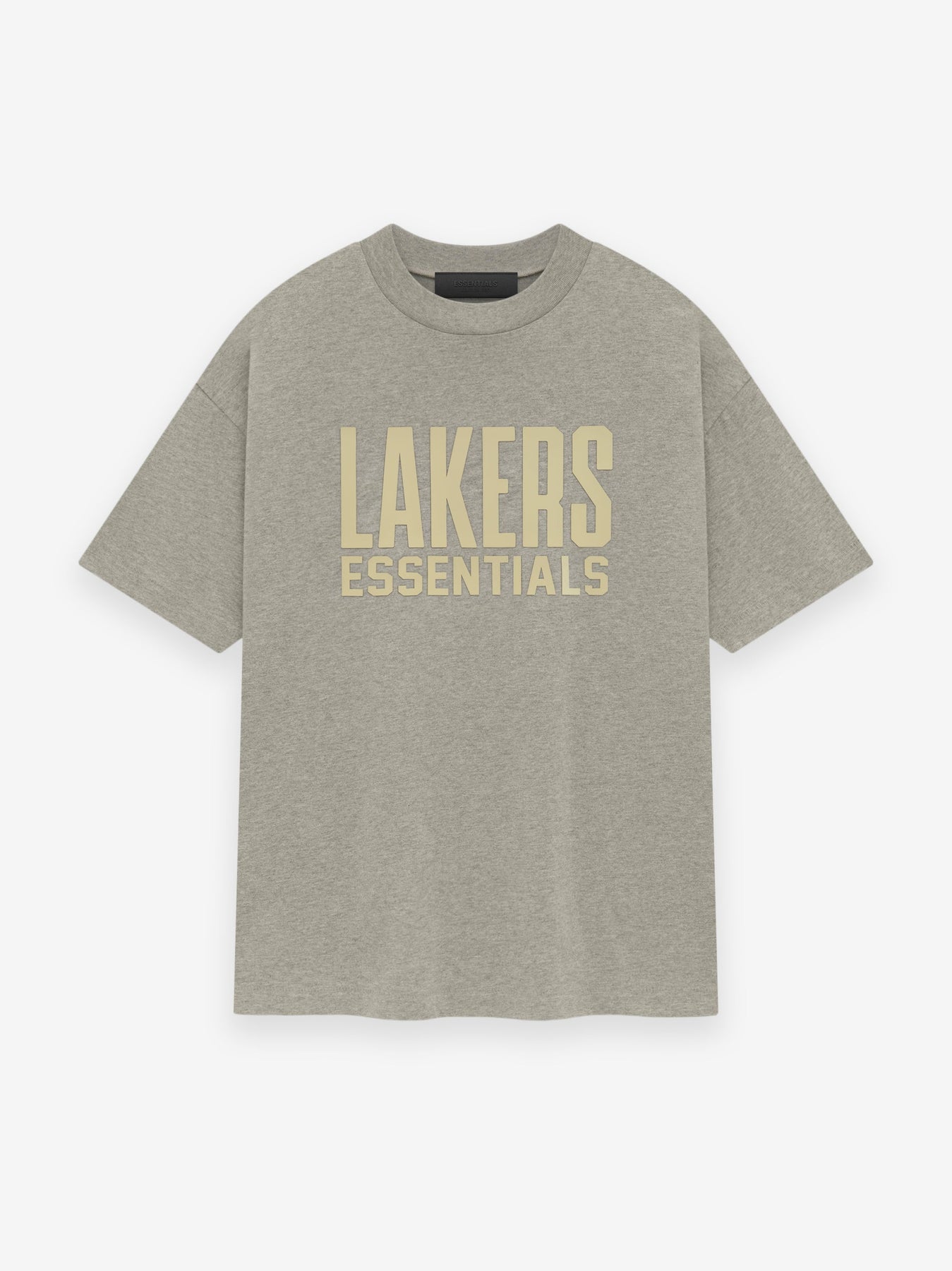 The Essentials Lakers short sleeve tee is crafted from core cotton jersey. It features a relaxed fit in the body with dropped shoulders and a rib-knit crewneck. On the front, there is a rubberized soft-touch Lakers Essentials lockup along with the iconic NBA logo on the back. Additionally, a rubberized Fear of God label is located at the back collar.
