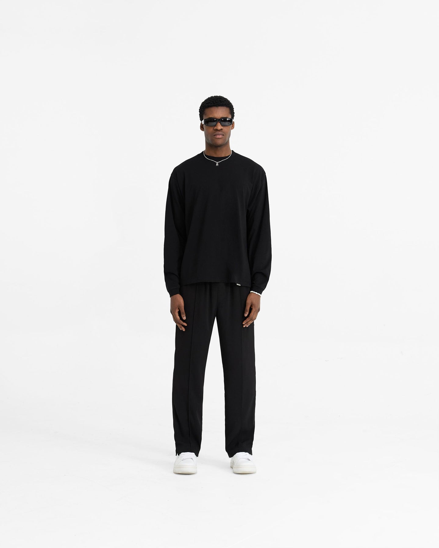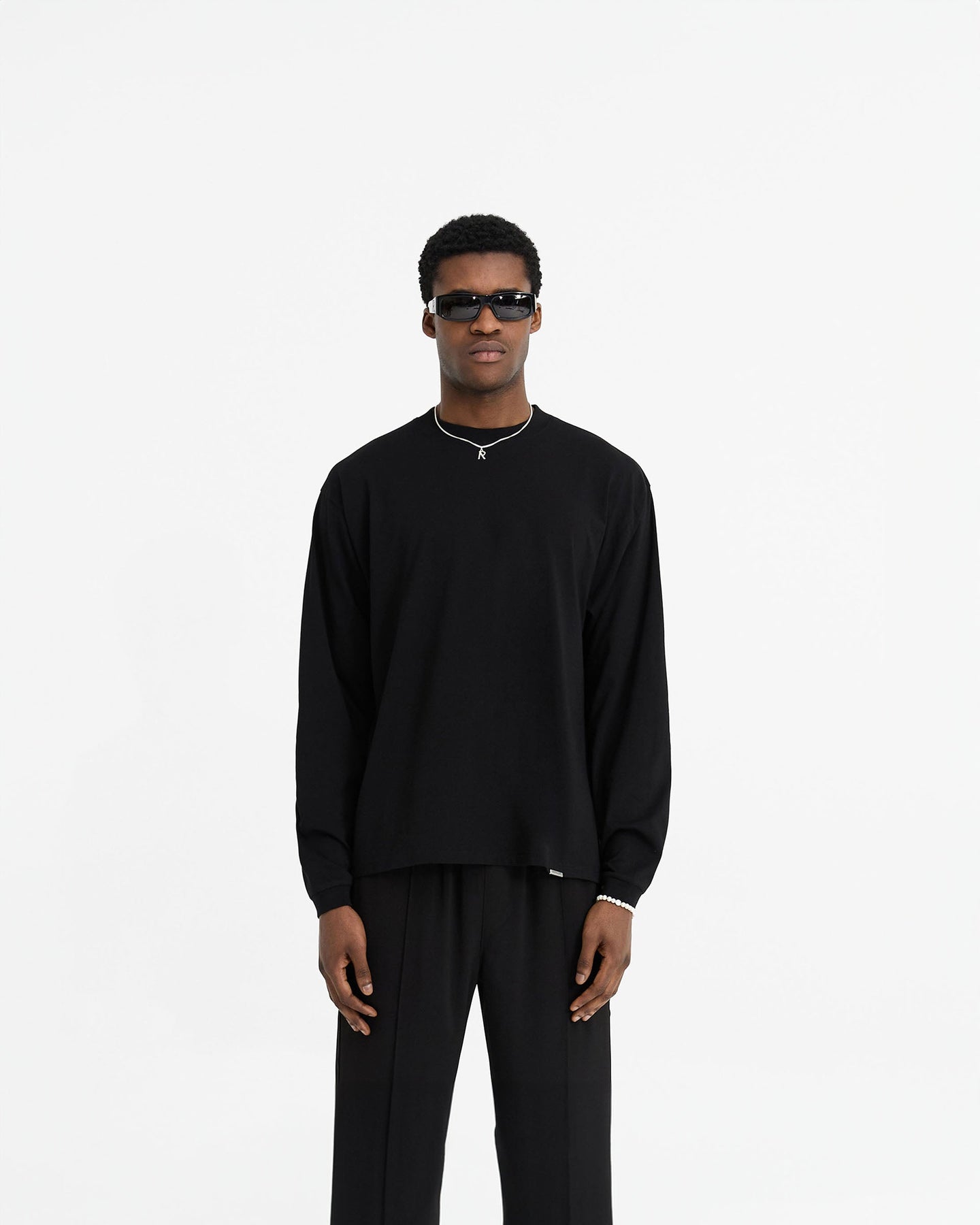 The Initial Long Sleeve T-Shirt in black has a regular fit to the chest and hem, crafted from 180gsm jersey cotton. It has a 1x1 small rib to the collar and cuffs, and is finished with an embroidered Initial to the back neck and Represent metal bar logo to the hem.