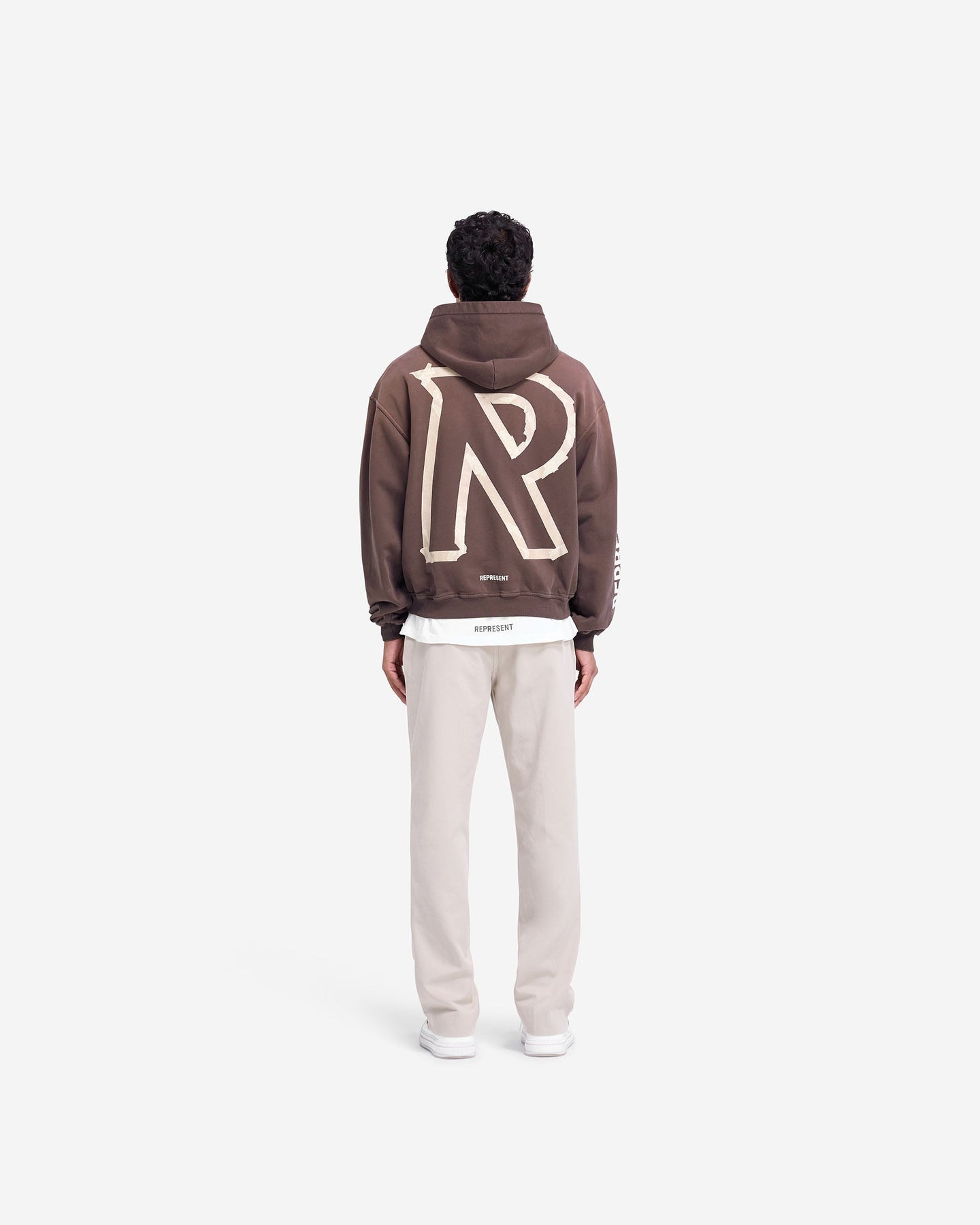 Introducing the Masking Tape Initial Zip Hoodie in Cedar, a luxury slightly oversized zip up hoodie, crafted from heavy weight jersey cotton. The hoodie showcases a 3D masking tape effect Initial to the front and back, with a cracked print to the sleeve. It has a corrosion vintage spray applied to the fabric, creating a vintage hue to the hoodie. The hoodie has a double ended front zip closure, and is finished with a Represent metal bar to the pocket.