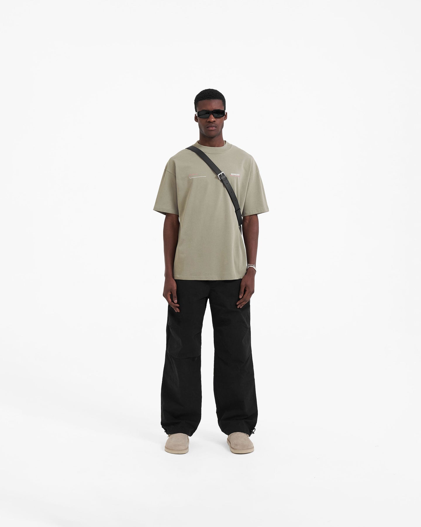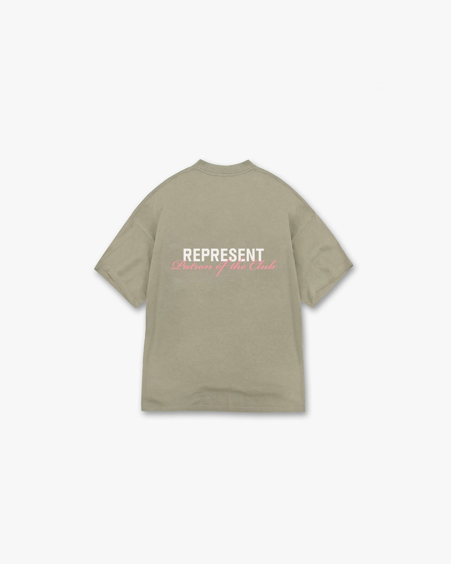 The Patron of the Club T-Shirt in Khaki features a slightly oversized fit. Crafted from medium weight jersey cotton and featuring a ribbed crewneck collar, it has white and pink Represent Patron of the Club branding to the chest and rear.