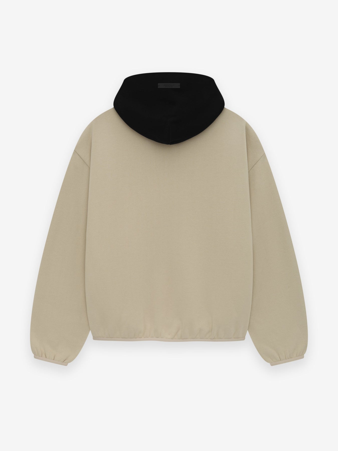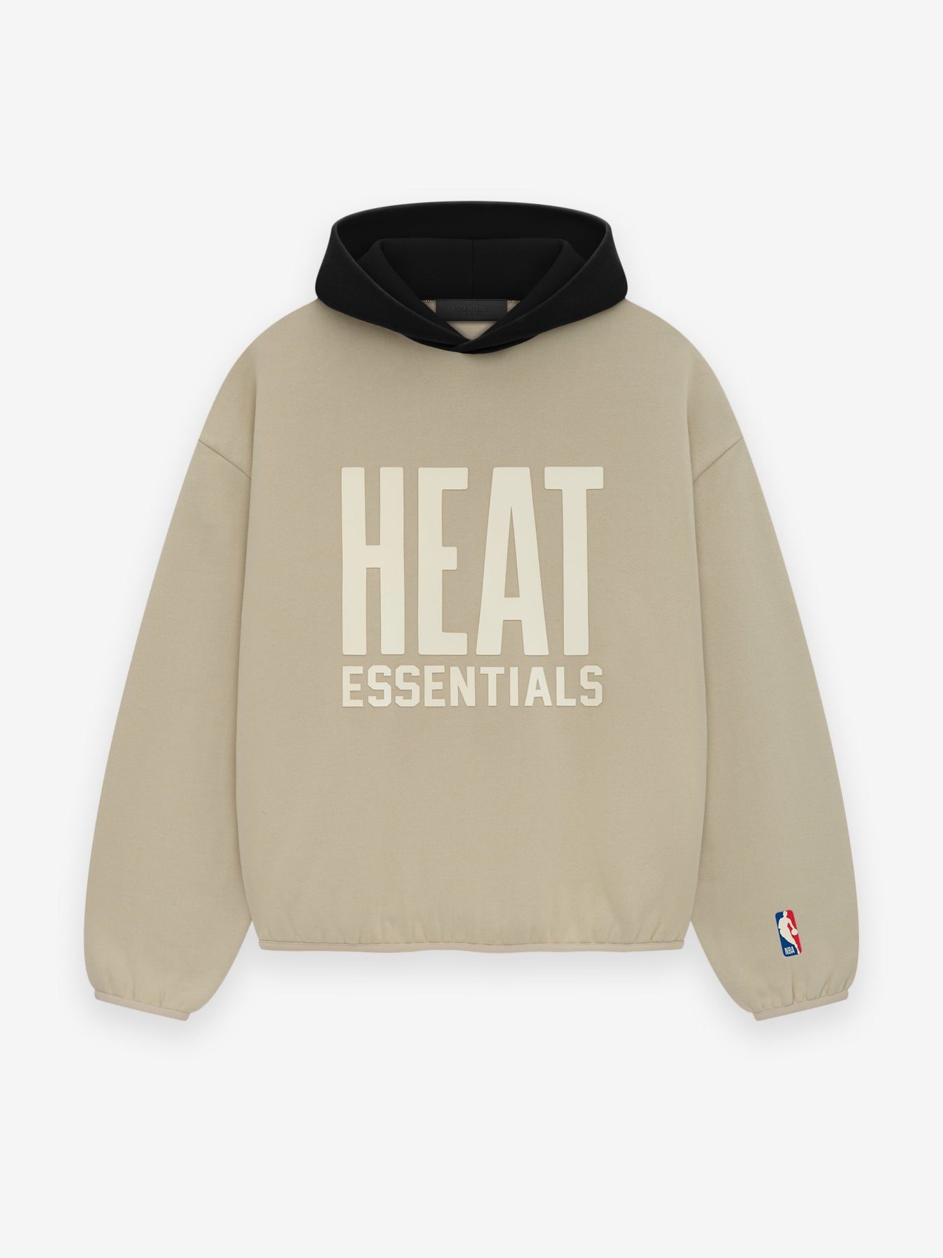 The Essentials Heat hoodie is made from core fleece and showcases a trendy cropped silhouette. The front features a rubberized soft-touch "HEAT ESSENTIALS" logo, along with the iconic NBA logo on the sleeve. Additional details include a contrasting double-layered hood, side seam pockets, and elastic bindings at the cuffs and hem. A rubberized "Essentials Fear of God" label is attached to the hood.