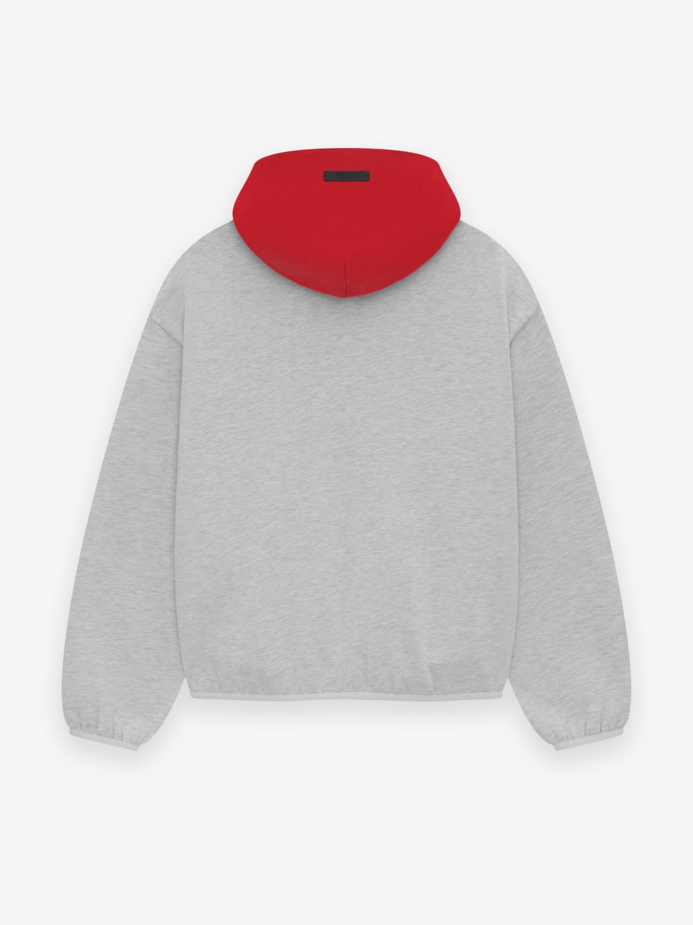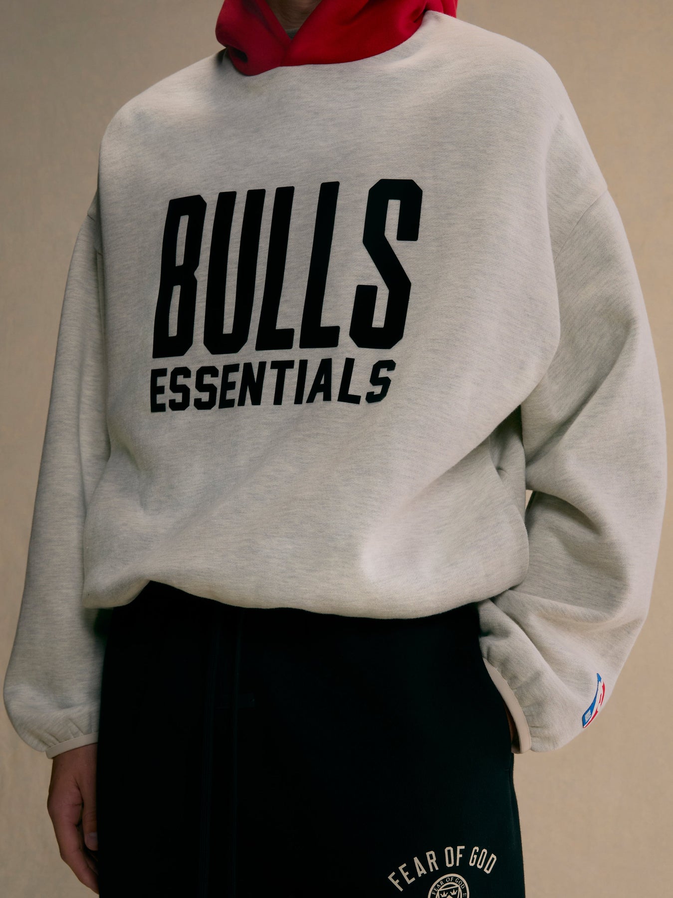 The Essentials Bulls hoodie is made from core fleece and showcases a trendy cropped silhouette. The front features a rubberized soft-touch "BULLS ESSENTIALS" logo, along with the iconic NBA logo on the sleeve. Additional details include a contrasting double-layered hood, side seam pockets, and elastic bindings at the cuffs and hem. A rubberized "Essentials Fear of God" label is attached to the hood.