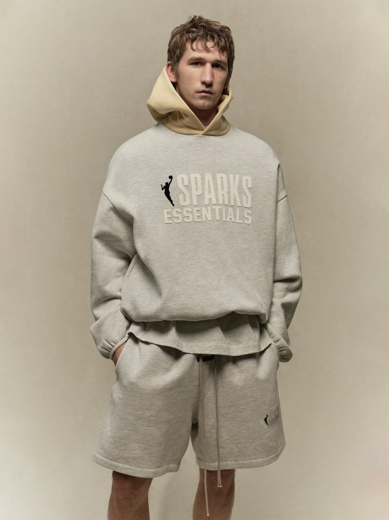 The Essentials Sparks hoodie is made from core fleece and boasts a voluminous, cropped silhouette. The front features a rubberized, soft-touch WNBA logo alongside the "SPARKS ESSENTIALS" lockup. Additional details include a contrasting double-layered hood, side seam pockets, and elastic bindings at the cuffs and waist hem. A rubberized "Essentials Fear of God" label is attached to the hood, while a WNBA logo is located on the back collar, underneath the hood.
