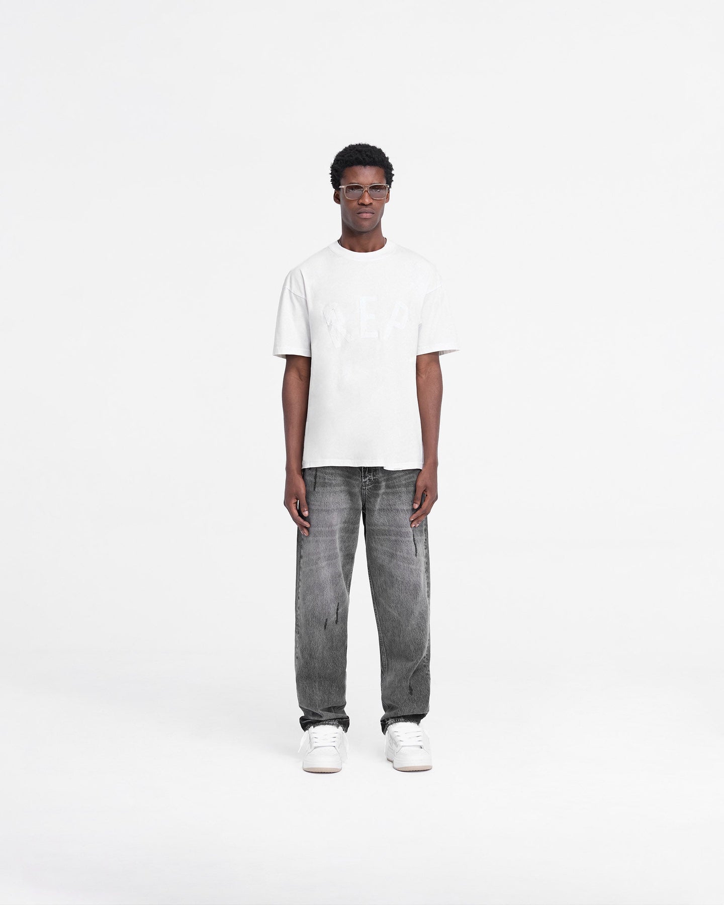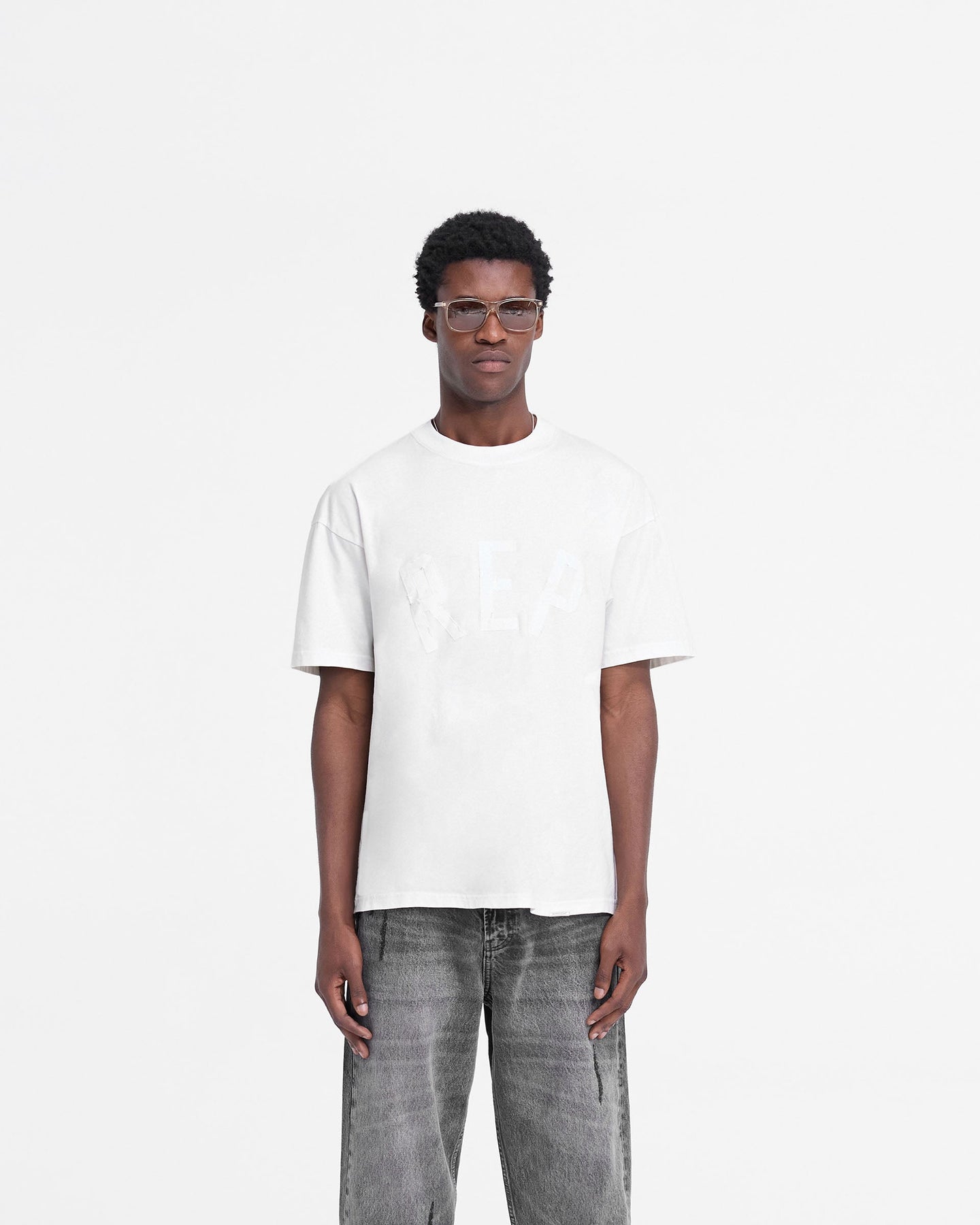 Introducing the Rep Applique T-Shirt in Flat White, with a slightly oversized fit. The t-shirt features a super soft, peached hand feel for a slightly more vintage look and feel, with overlock stitching to shoulder seams. The t-shirt has a distressed applique cotton twill Rep logo to the front and is finished with a Represent metal bar logo to the hem.