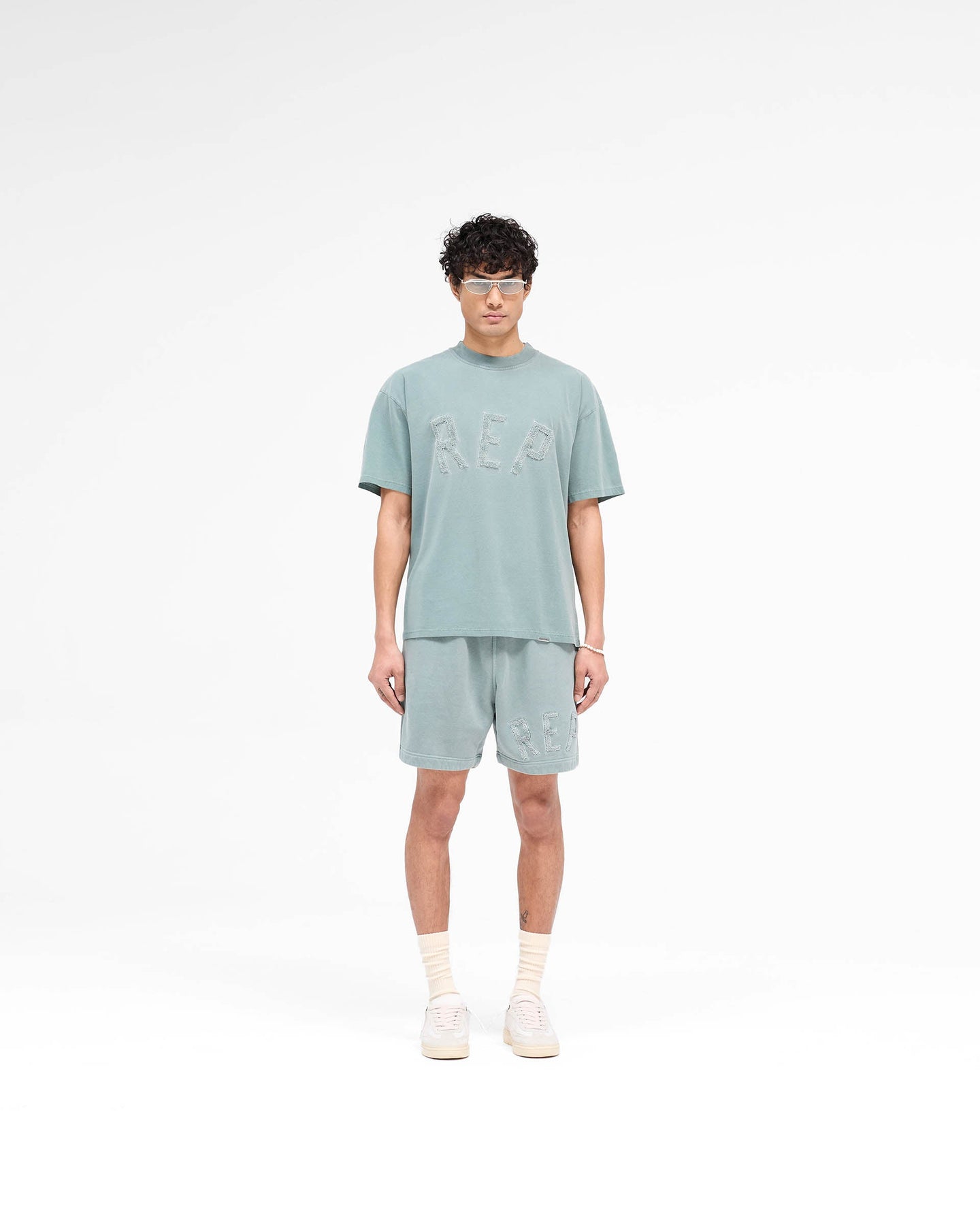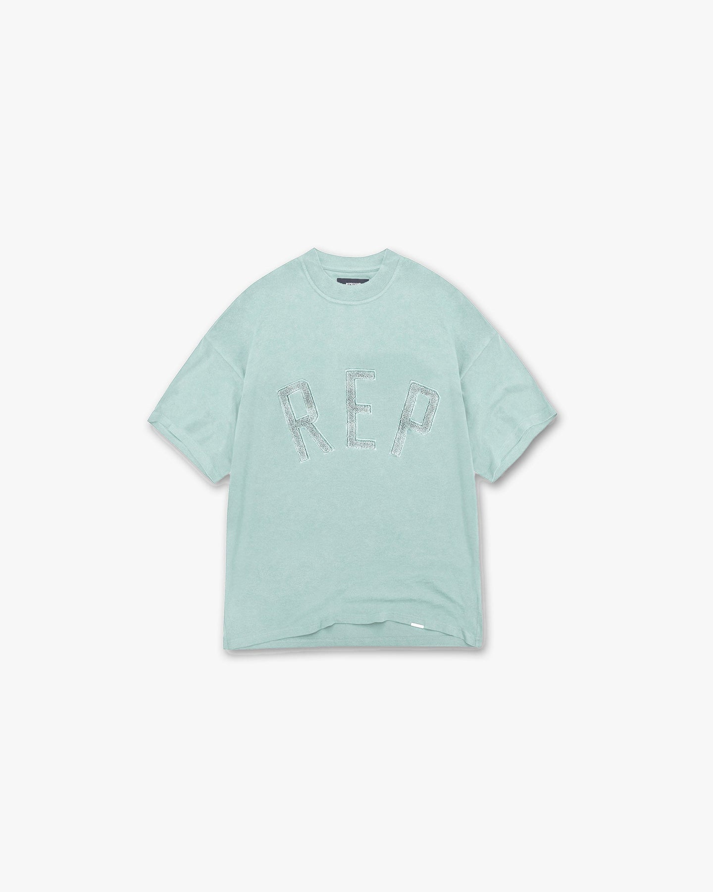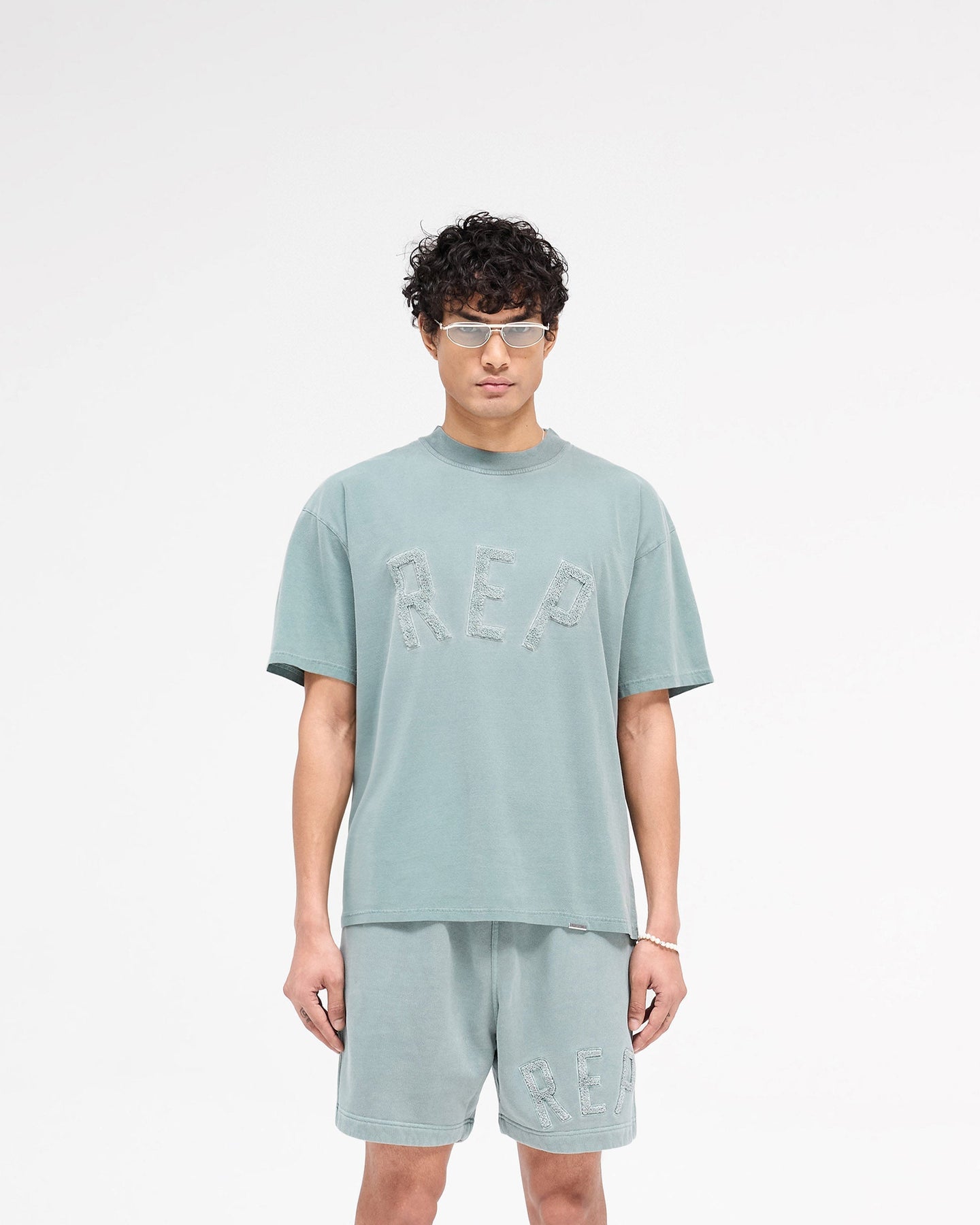 Introducing the Rep Applique T-Shirt in Forest Green, a medium weight t-shirt crafted with a slightly oversized fit.  The t-shirt showcases a textured Rep applique to the front, with overlock seams to the shoulders as an additional design detail. It is finished with a Represent metal bar logo to the hem.