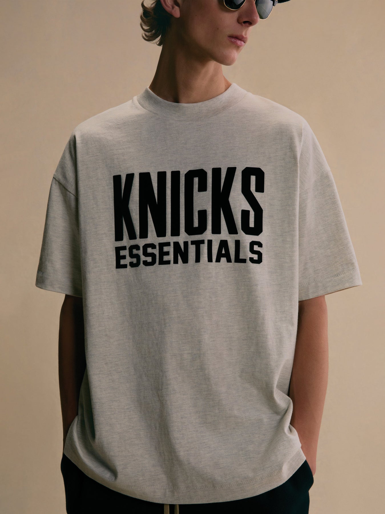 The Essentials Knicks short sleeve tee is crafted from core cotton jersey. It features a relaxed fit in the body with dropped shoulders and a rib-knit crewneck. On the front, there is a rubberized soft-touch "KNICKS ESSENTIALS" lockup, along with the iconic NBA logo on the back. Additionally, a rubberized "Essentials Fear of God" label is located at the back collar.