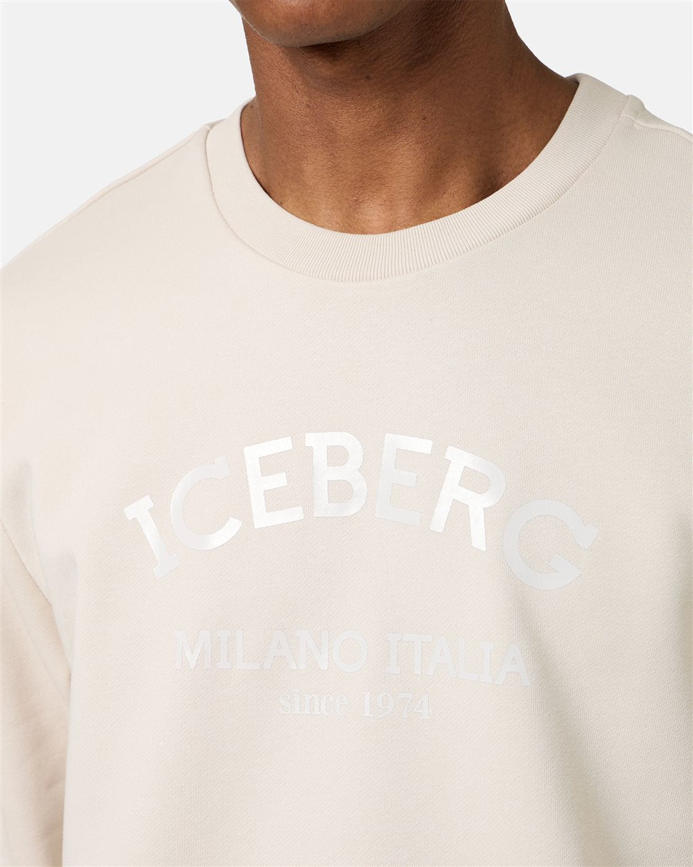 Powder white crewneck slim fit sweatshirt made of GOTS certified sustainable fleece fabric, for an eco-friendly and refined look. The shiny Iceberg logo print in tone on the front adds a modern and sophisticated touch, making this garment perfect for those seeking style and sustainability. Ideal for a casual but refined look.