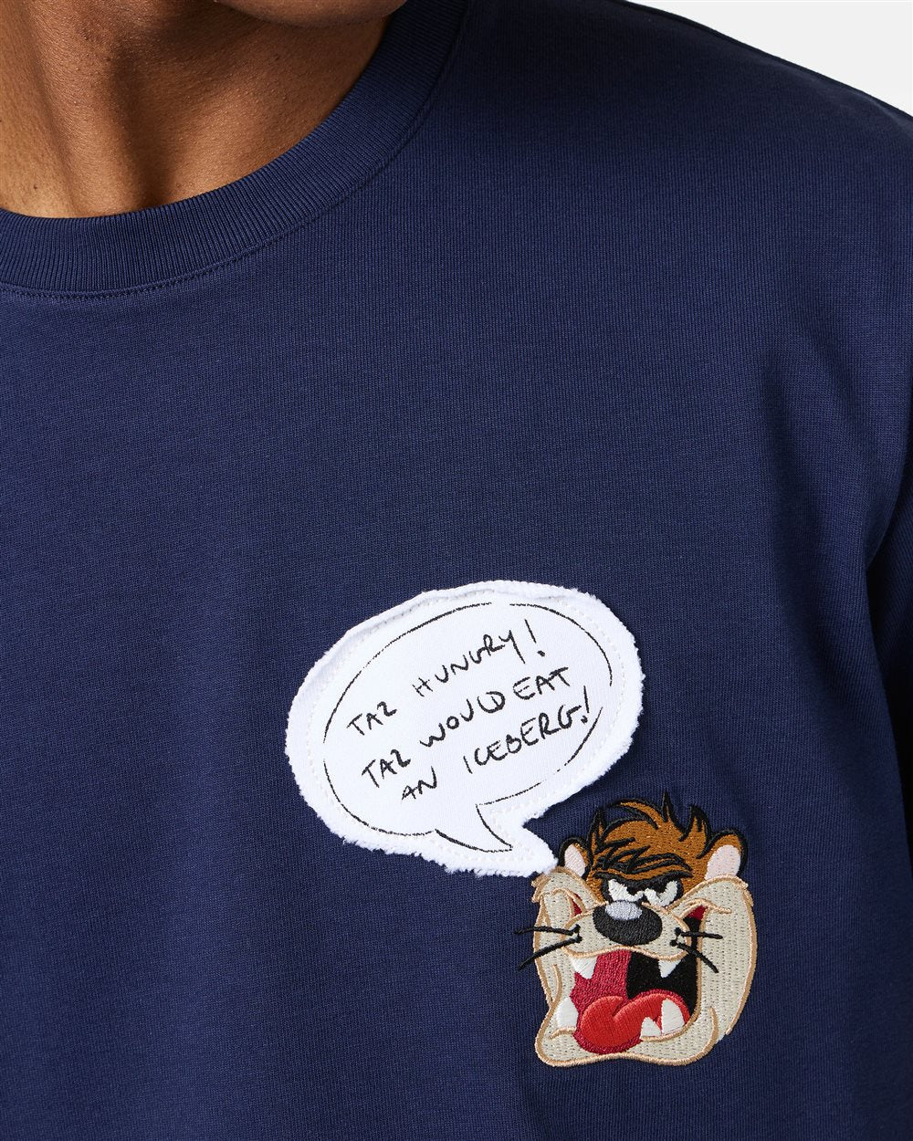 Blue classic regular fit T-shirt made of soft cotton jersey, embellished with an exclusive embroidery born from the collaboration with Looney Tunes. A distinctive detail that celebrates the cartoon world with style. The design is completed by the jacquard label with logo applied on the sleeve, perfect for adding an original touch to your casual looks.