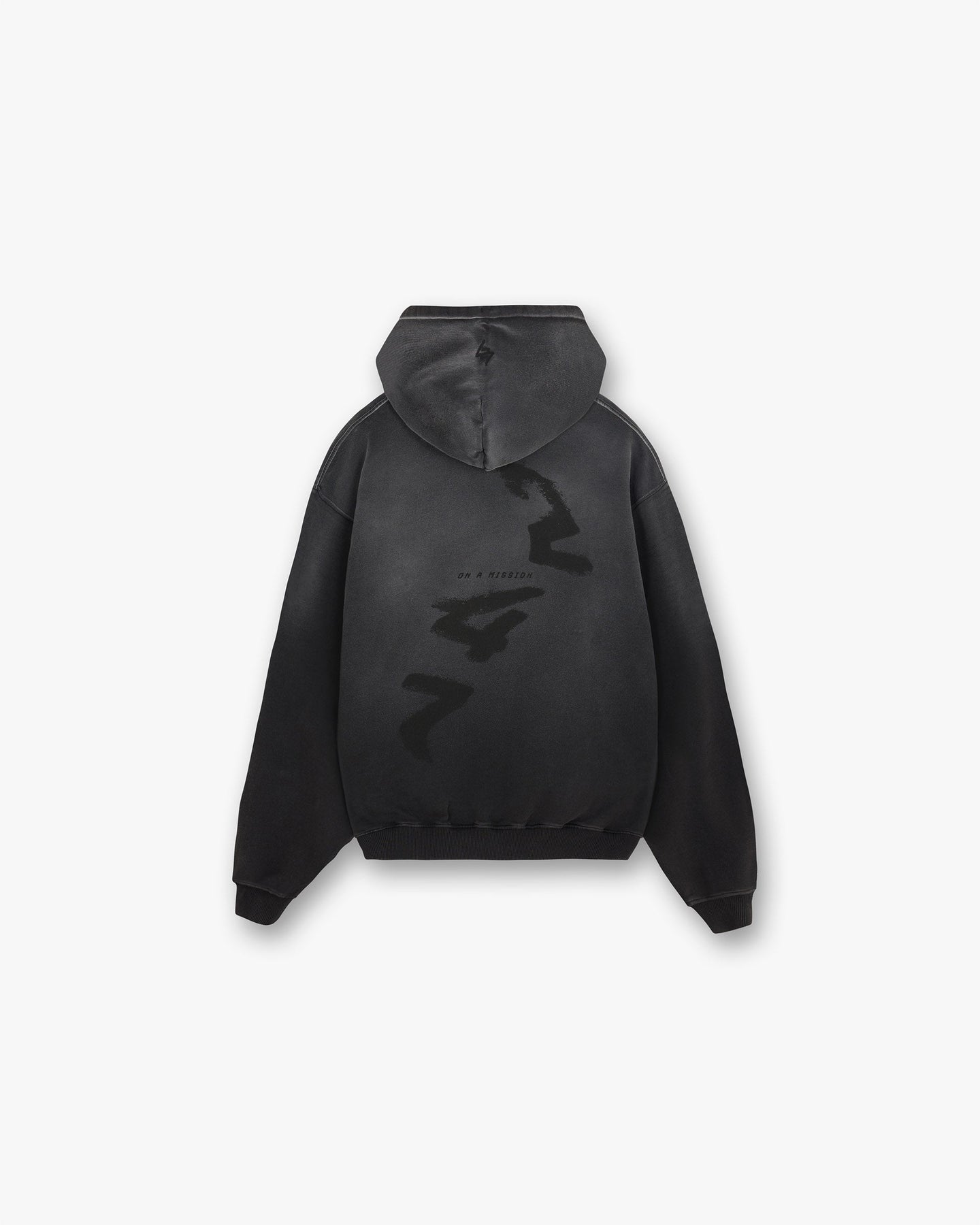 This hoodie features a water-based 247 motion print to the front and back, and tonal drawcords to the hood for an adjustable fit. The hoodie has a fade-out wash with spray applied for a vintage aesthetic.