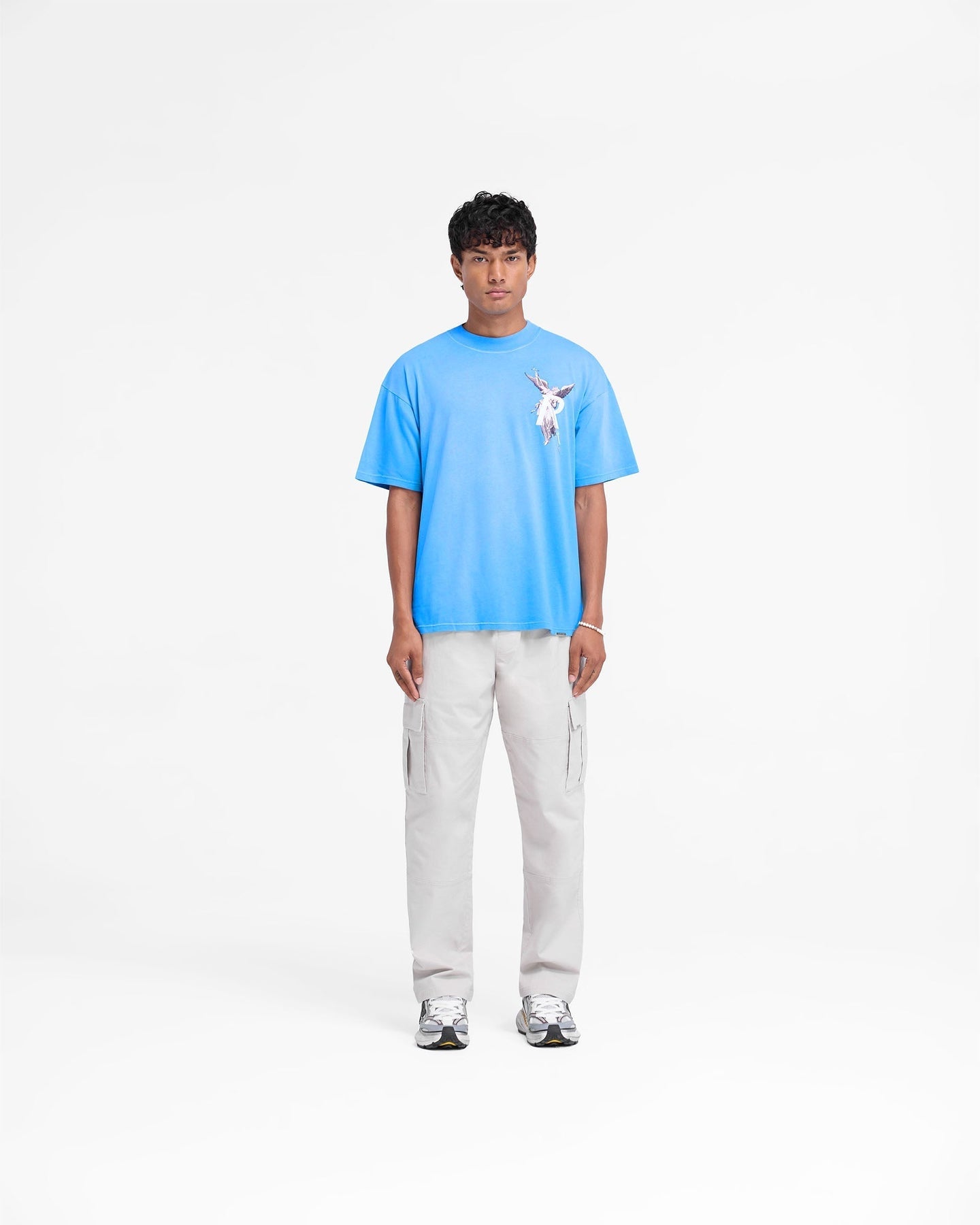 Introducing the Archangel T-Shirt in Electric Blue, a slightly oversized t-shirt with a sun fade wash. The t-shirt showcases our textured high density screen printed Archangel graphic to the front and back, and a Represent metal bar logo to the hem.