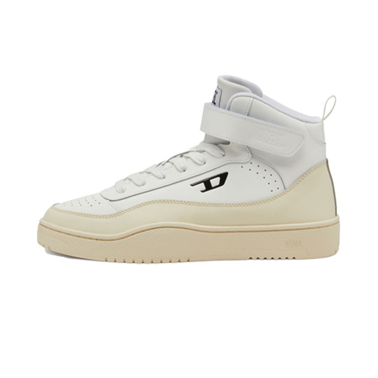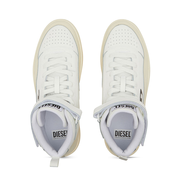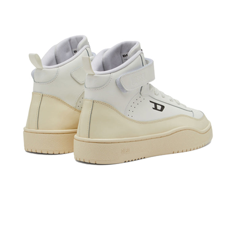 Men's mid top sneaker made of soft calfskin leather with avant garde details. The nineties inspired upper has a classic silhouette, with contrasting Diesel logos on the tongue at the side. A tonal Diesel logo also features on the velcro ankle strap. The chunky rubber sole has a custom tread.