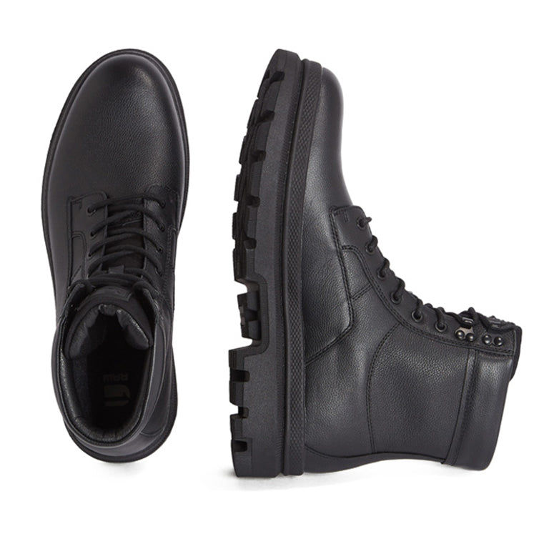 The Arron Lace boots are cut in a mid height. A sturdy leather upper is combined with a rough structured outsole. The graphic at the side is stamped in. Metallic hooks and eyelets offer a firm closure.