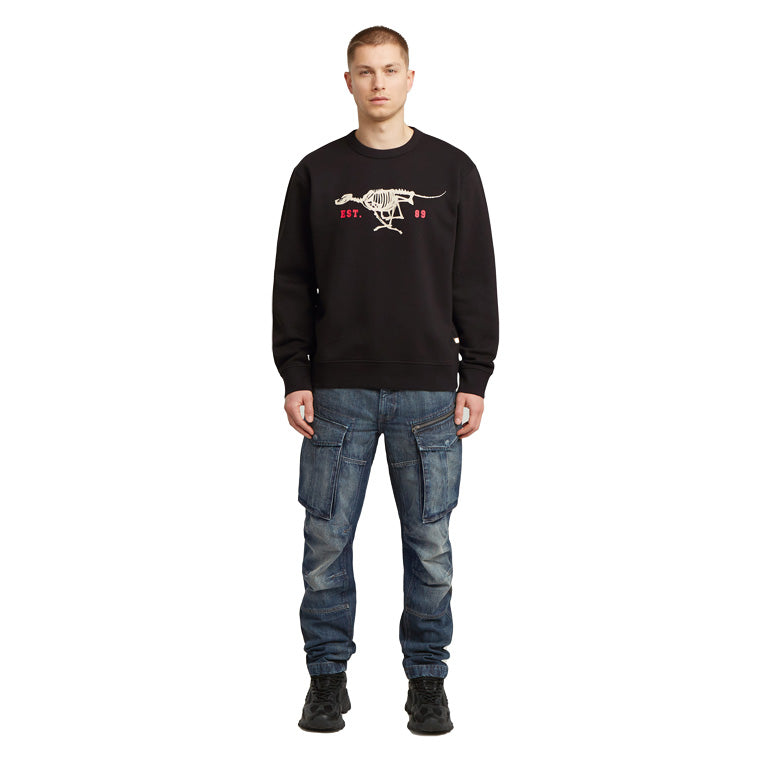 The Running Dog Back Graphic Sweater features a relaxed fit with graphic prints on the front and back, adding a bold touch.