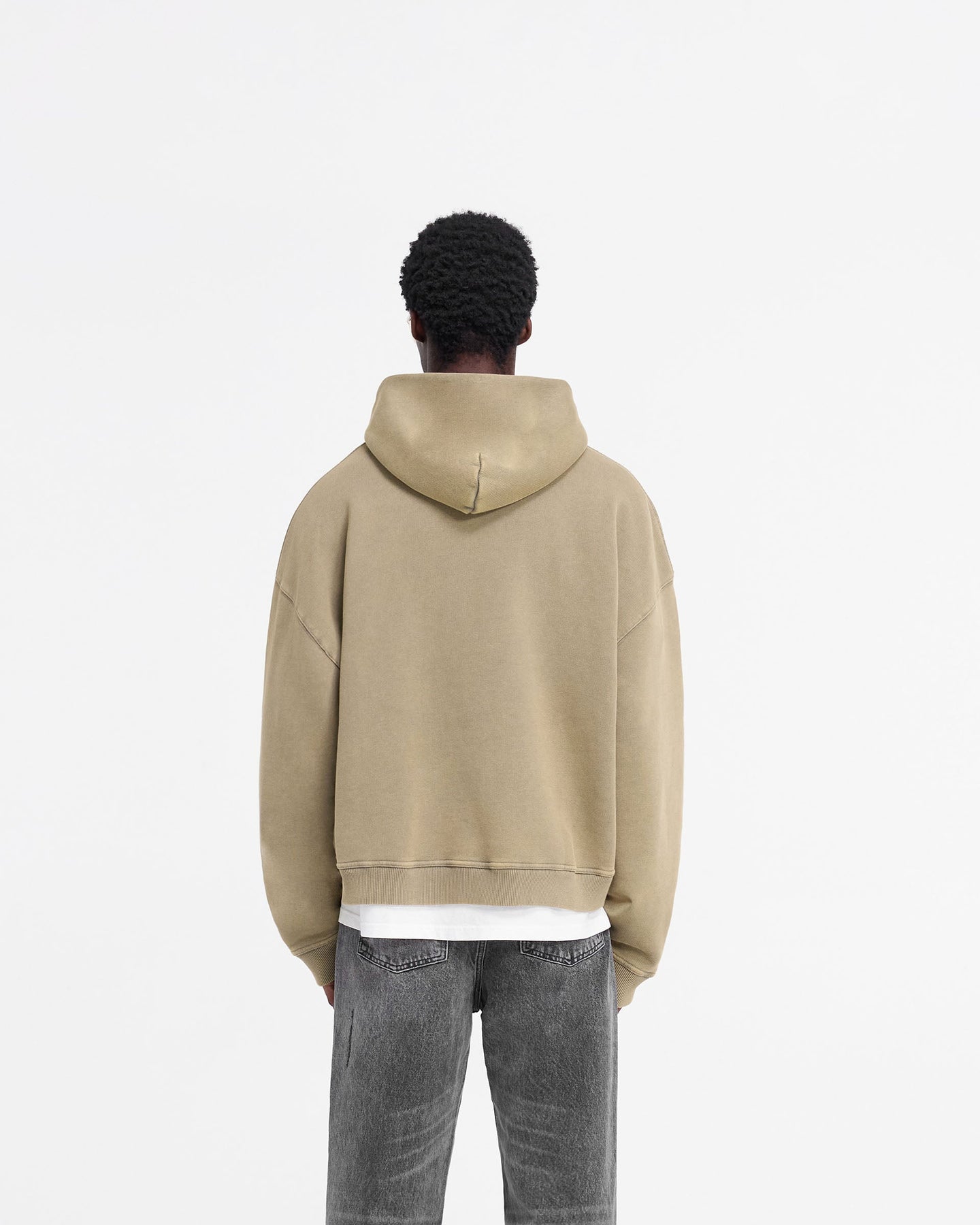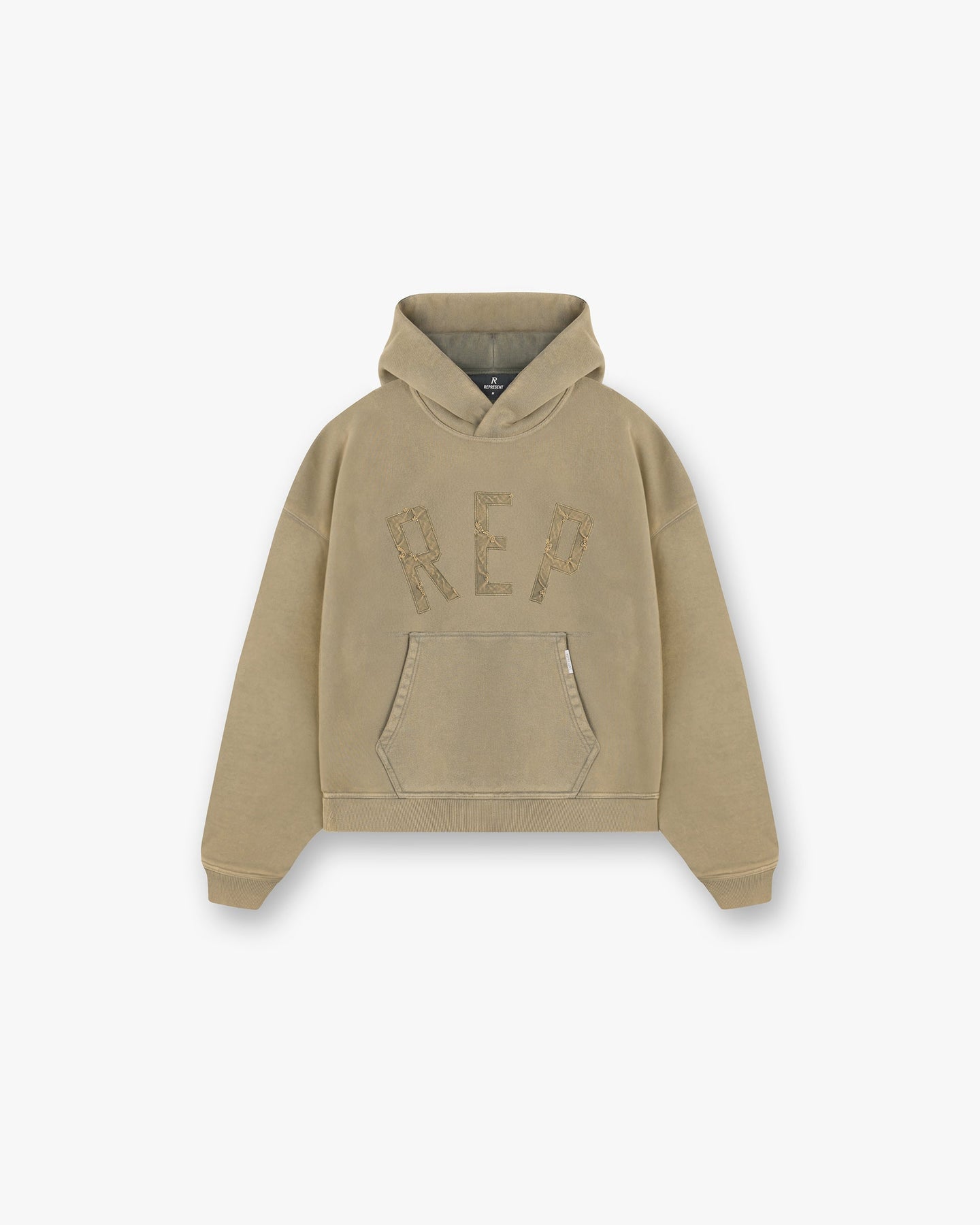 Introducing the Rep Applique Hoodie in Fawn, an oversized boxy sweater crafted from heavy weight jersey cotton, with a ribbed hem and cuffs and a sun fade wash. The hoodie showcases a distressed applique cotton twill Rep logo to the front and is finished with a Represent metal bar logo to the pocket.