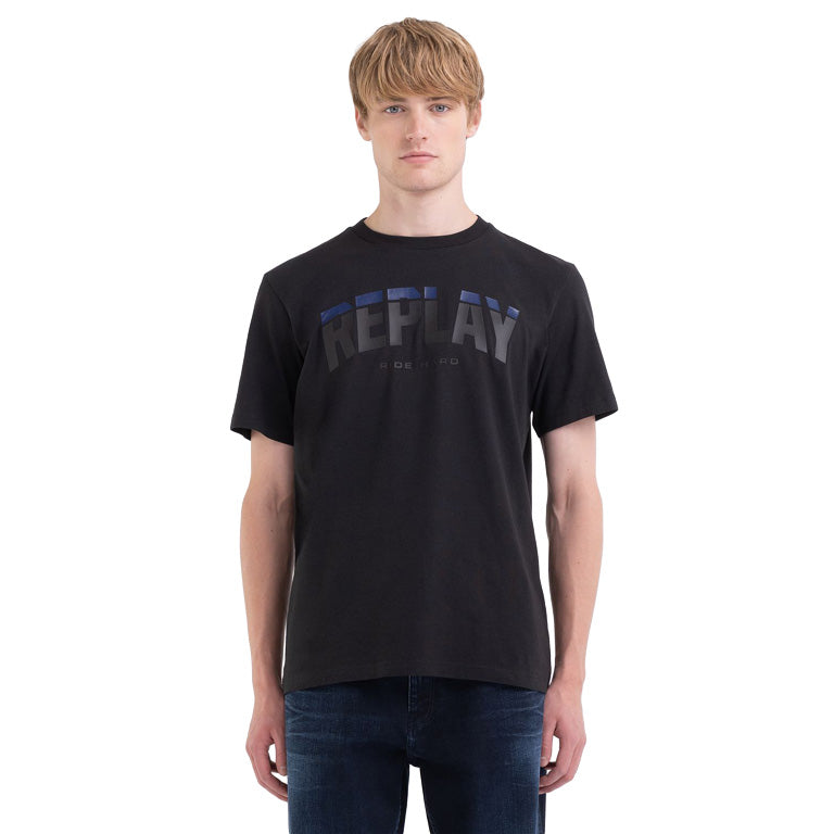 Crewneck t-shirt made of piece-dyed heavy cotton jersey. The short-sleeved garment with regular slim fit is characterized by the customized two-tone print with rider pattern at the front.