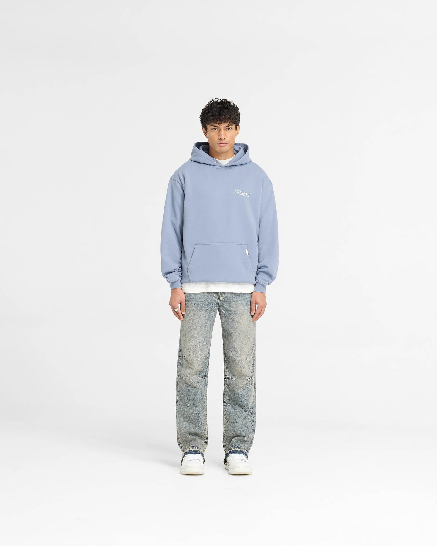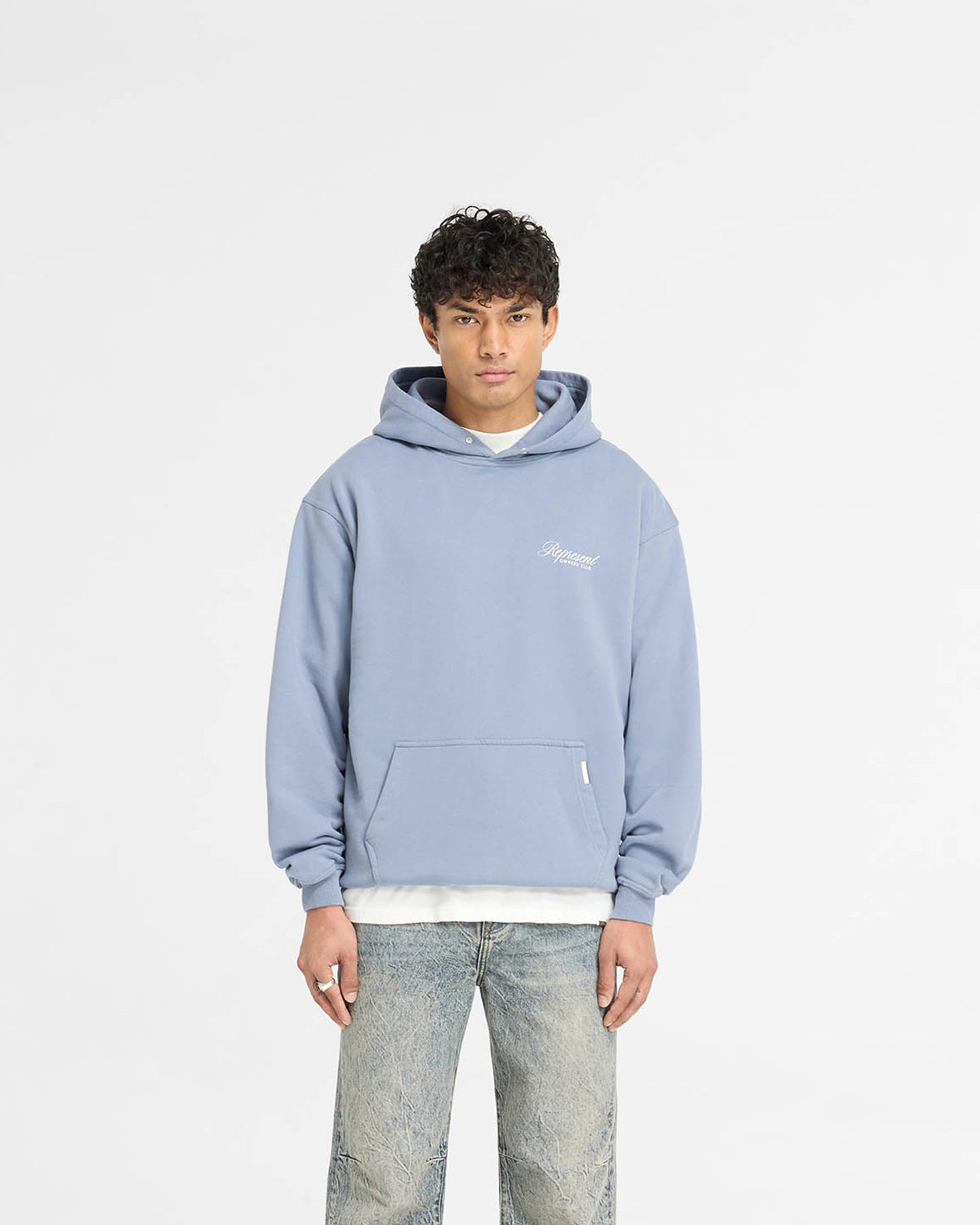 Introducing the latest evolution of the Represent Owners’ Club Hoodie in Dusty Blue, crafted from heavy weight jersey cotton with a slightly oversized fit. The hoodie features a ribbed hem and cuffs, with a Cobrax popper to the hood and Represent metal bar to the pocket.