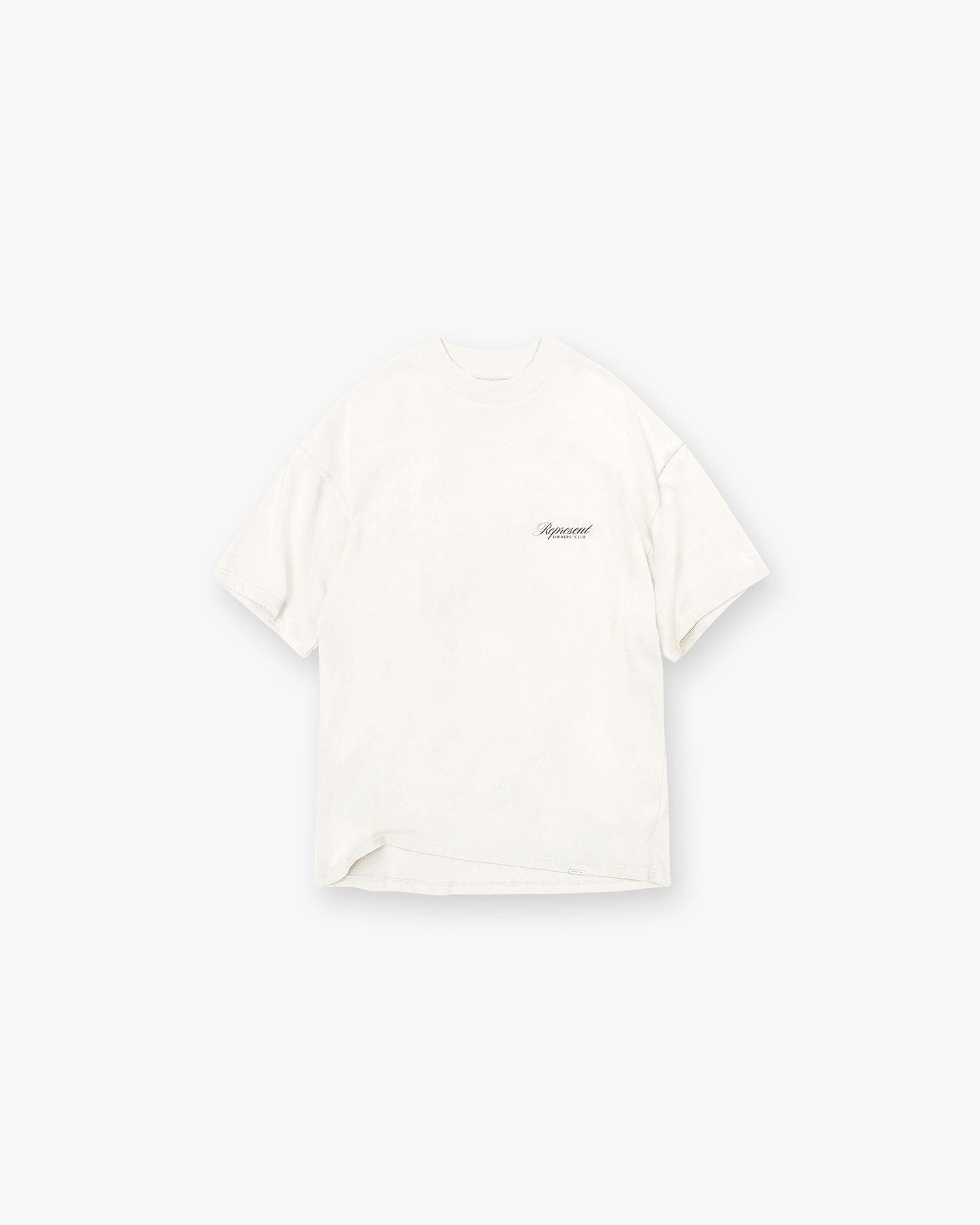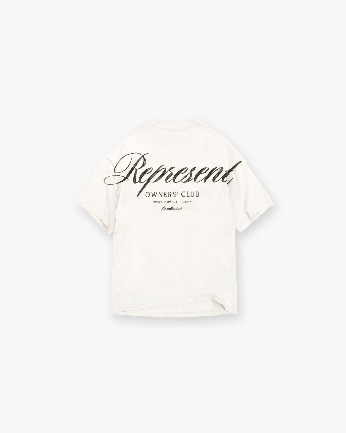 Introducing the latest evolution of the Represent Owners’ Club T-Shirt in Flat White, an oversized t-shirt crafted from luxury medium weight cotton. This t-shirt has a ribbed crewneck collar and a Represent metal bar to the hem.