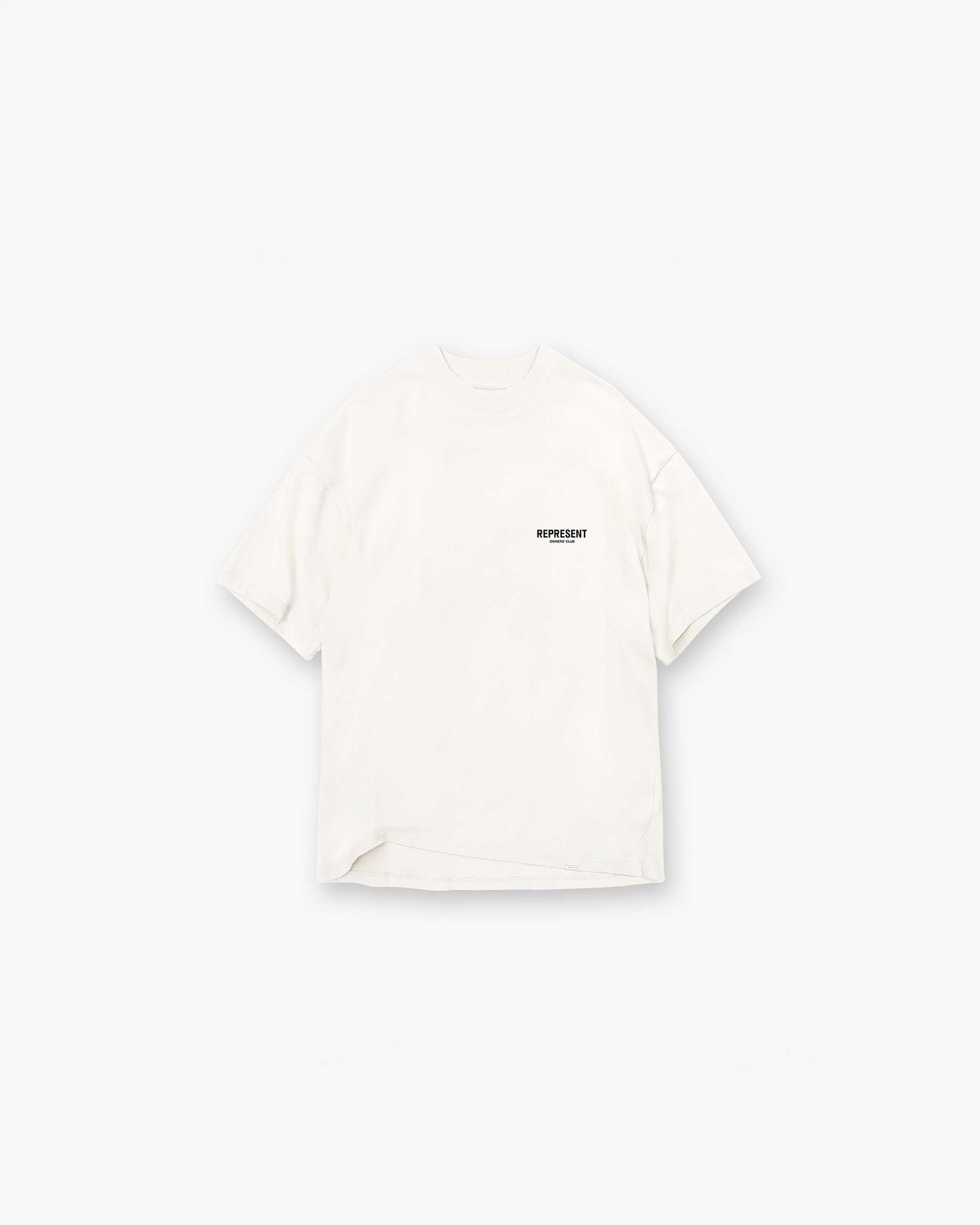 Short sleeve jersey oversized white t-shirt. Crafted from a medium weight cotton. Ribbed crewneck collar. Represent Owners Club graphic branding to the rear and chest. Logo bar to the hem.