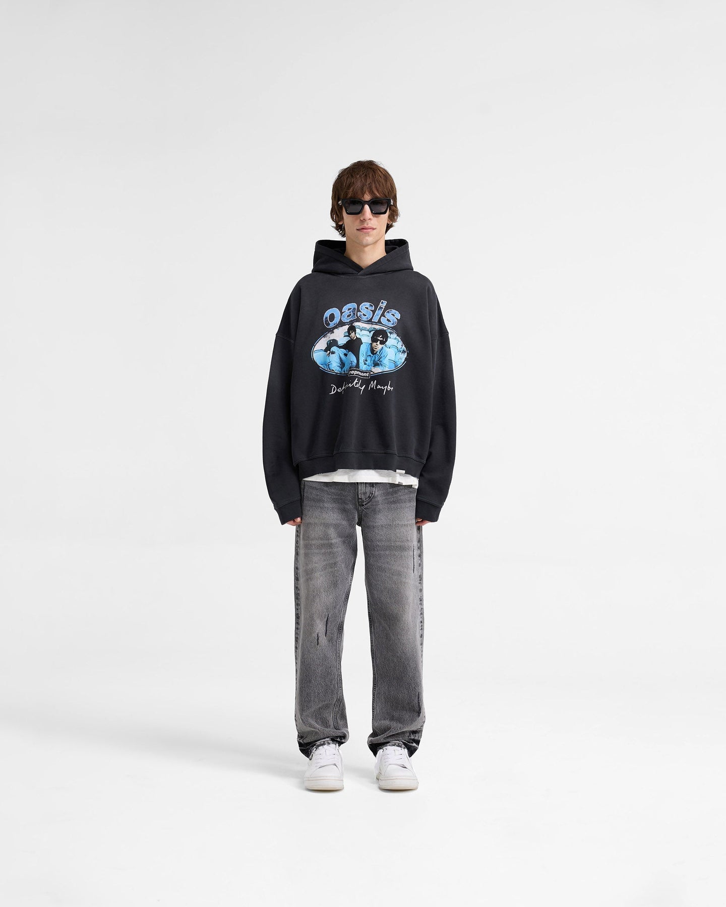 The hoodie is in our oversized boxy fit, with dropped shoulders, wide sleeves and a slightly cropped body. The hoodie itself has nibbling distressed details throughout. It is finished with an optional rip away Oasis Ticket Stub, with the date referring to the release of the Definitely Maybe Album, and a Represent metal bar to the hem.