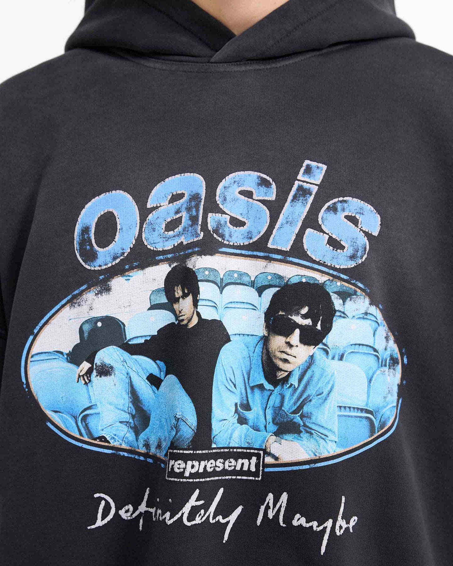 Introducing the Represent x Oasis Maine Road Hoodie in Stained Black with spray applied. Designed to celebrate the 30 year anniversary of Definitely Maybe, the hoodie presents an iconic image of the brothers at Maine Road to the front and back, with a distressed print for a vintage look and feel. To the back is Represent Manchester artwork, with the 1994 date referring to the year of the Definitely Maybe album release.