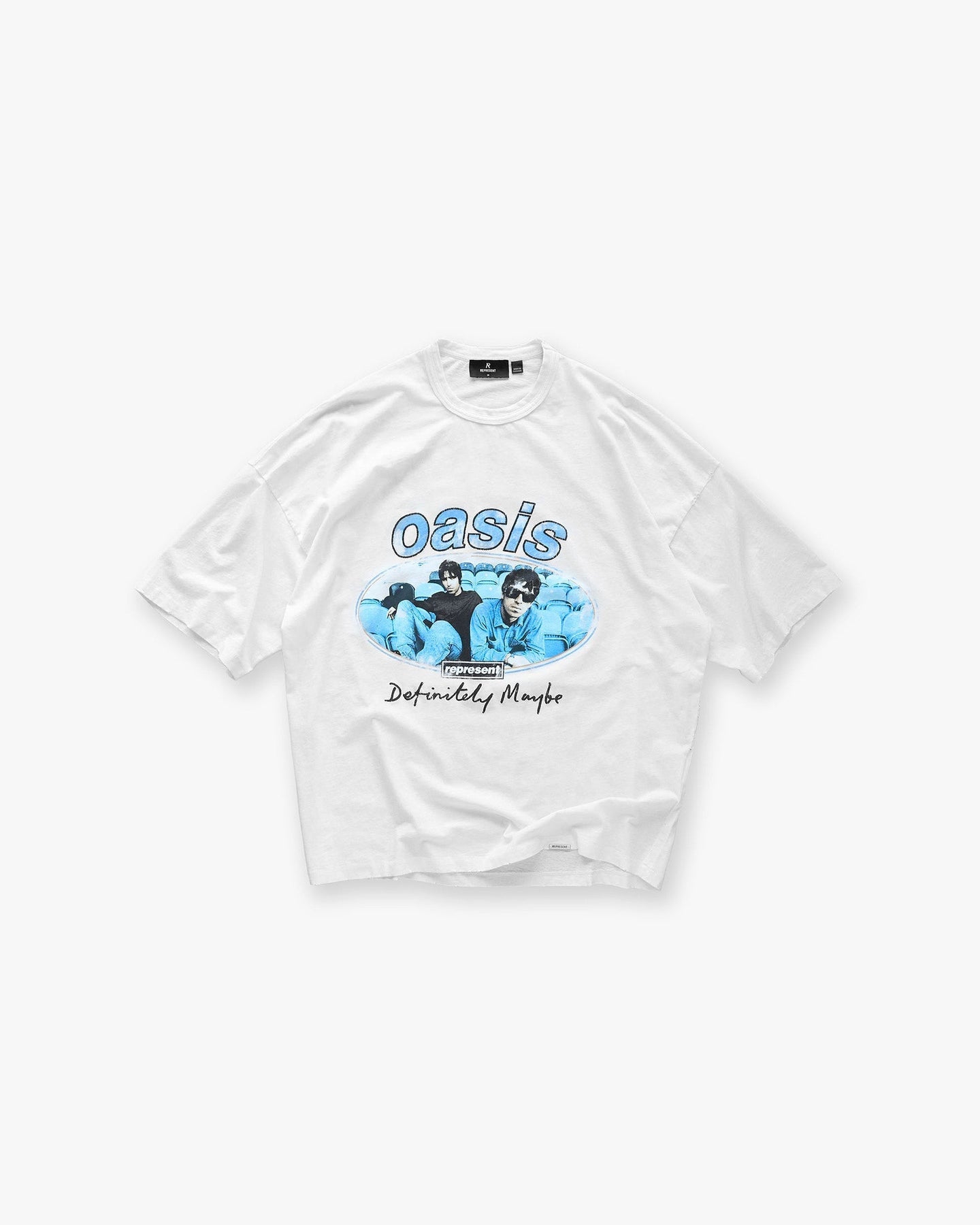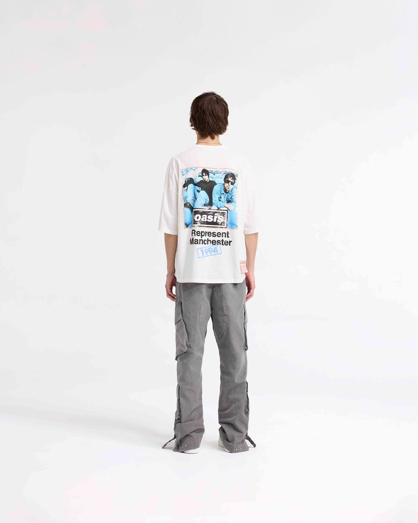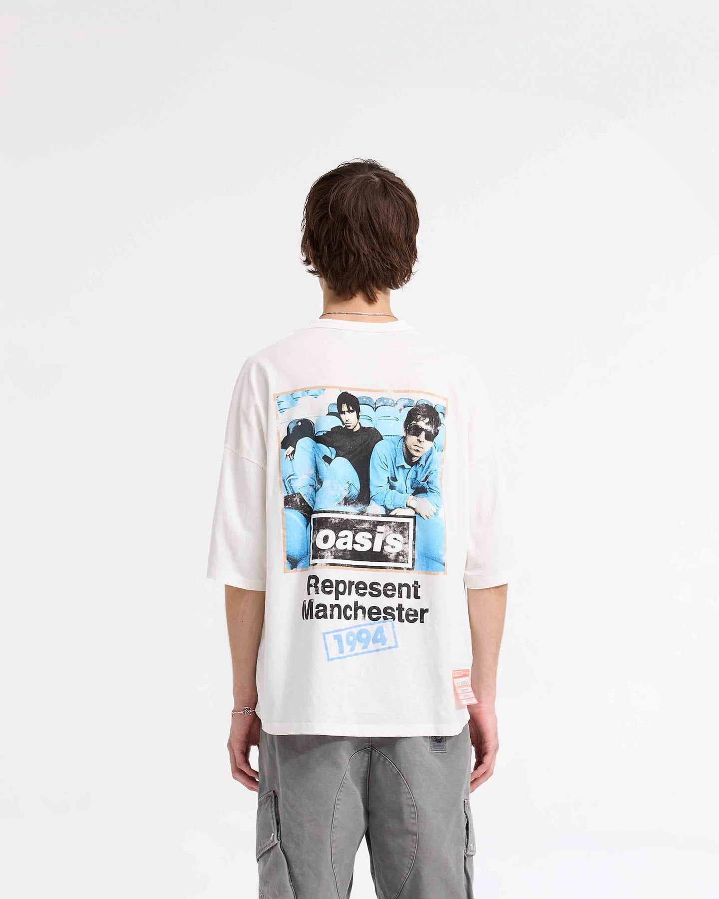 Introducing the Represent x Oasis Maine Road T-Shirt in Flat White. Designed to celebrate the 30 year anniversary of Definitely Maybe, the tee presents an iconic image of the brothers at Maine Road to the front and back, with a distressed print for a vintage look and feel. To the back is Represent Manchester artwork, with the 1994 date referring to the year of the Definitely Maybe album release.