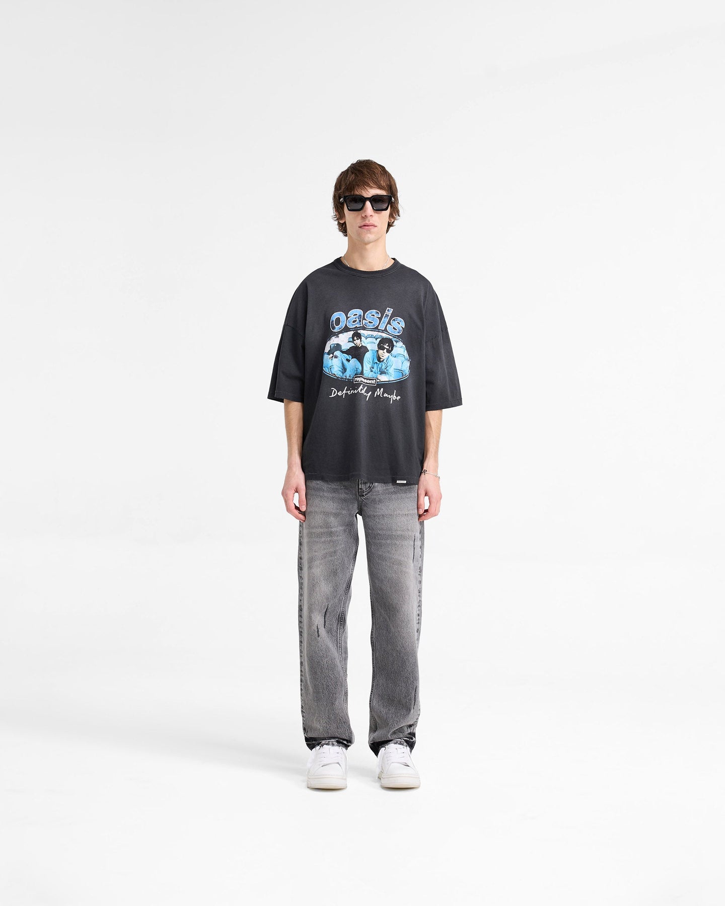The t-shirt is in our oversized boxy fit, with dropped shoulders and longer sleeves. The tee itself has nibbling distressed details throughout. It is finished with an optional rip away Oasis Ticket Stub, with the date referring to the release of the Definitely Maybe Album, and a Represent metal bar to the hem.