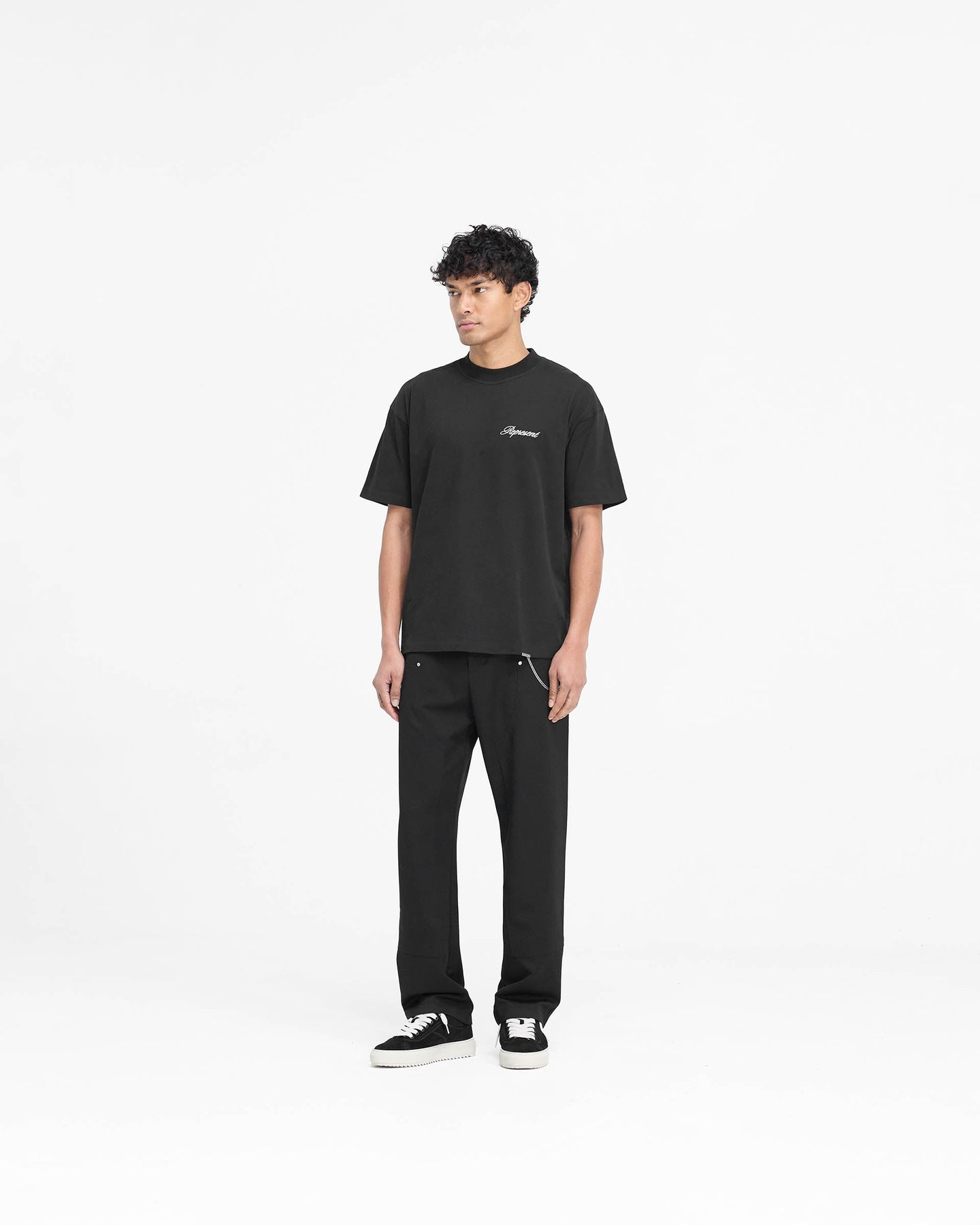 Introducing the Script Logo T-Shirt in Black, a slightly oversized t-shirt crafted from 100% jersey cotton with a carbon finish for a super soft hand feel. The t-shirt has a blind hem for a minimalist finish, with high build embroidered script branding to the front. It is finished with a Represent metal bar to the hem.
