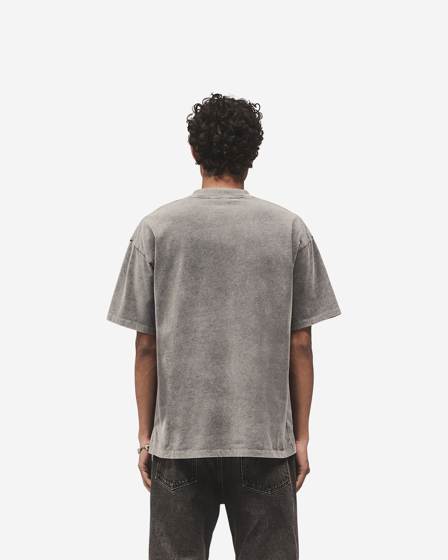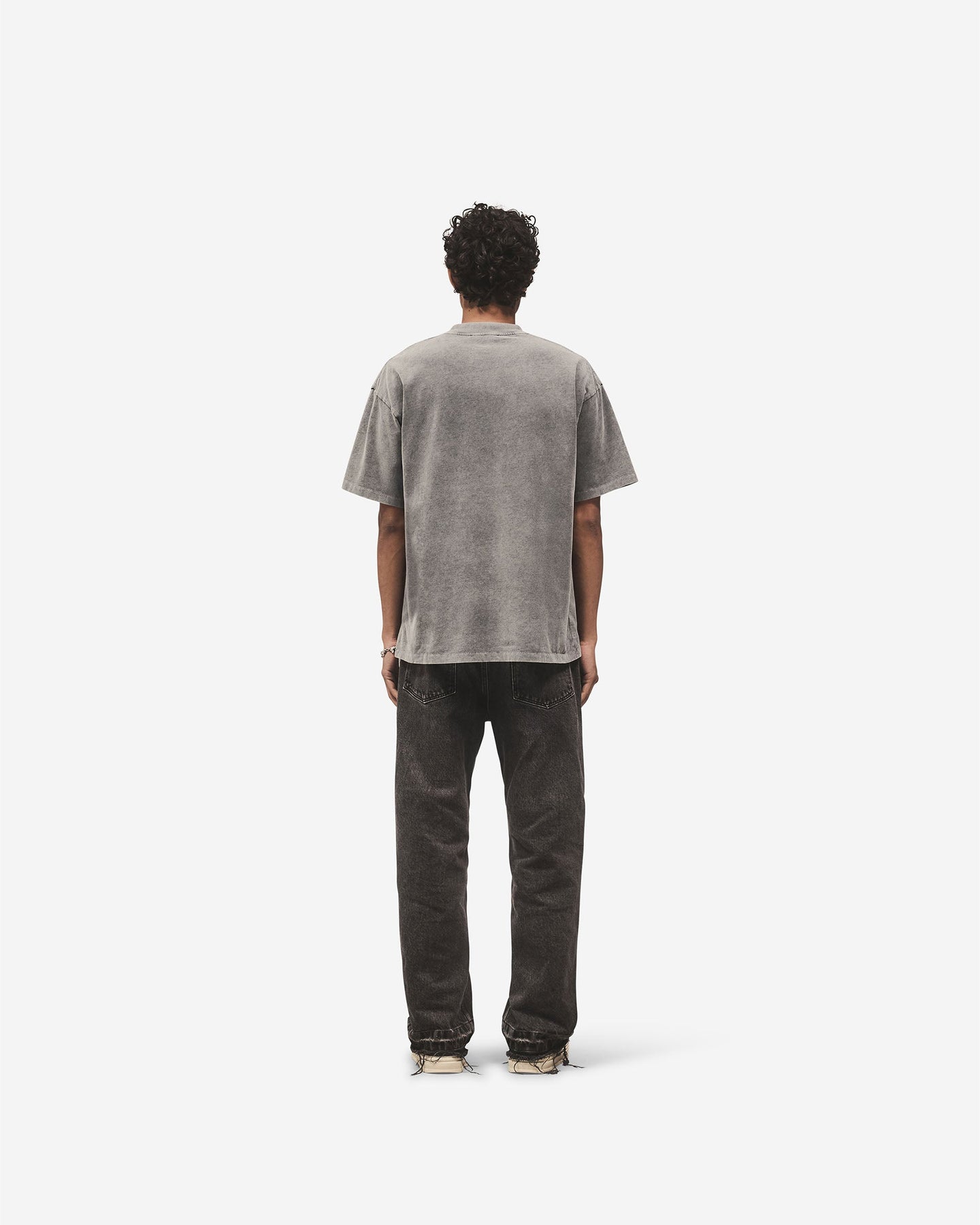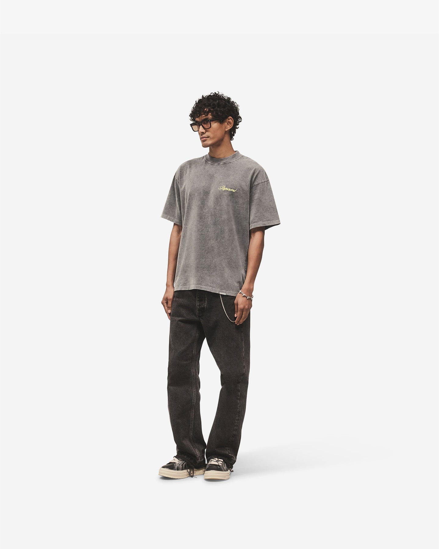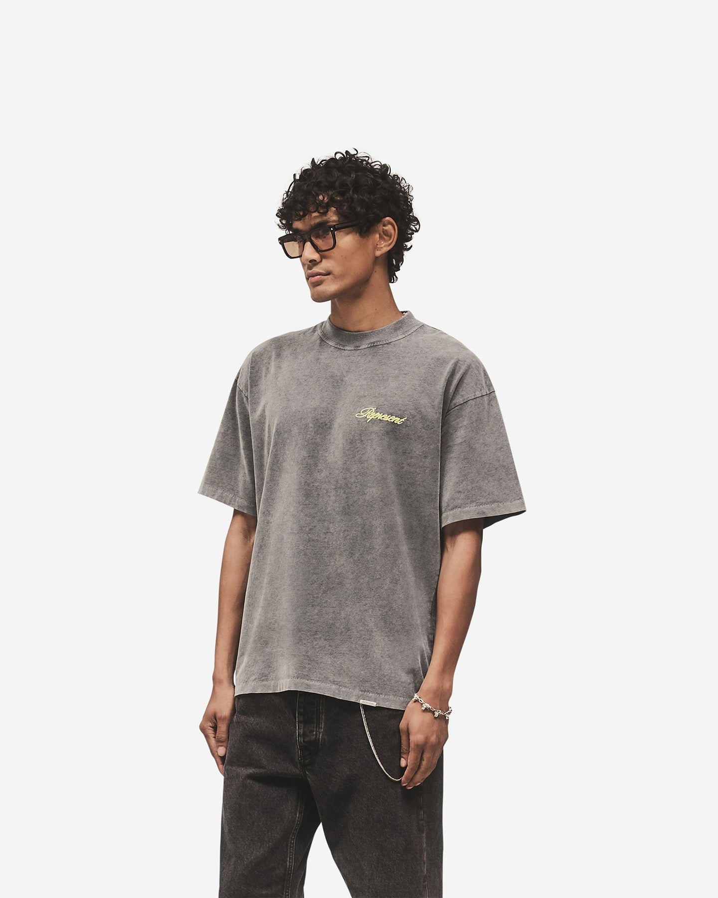 Introducing the Script Logo T-Shirt in Vintage Grey, a slightly oversized t-shirt constructed from washed jersey cotton for a lived-in aesthetic. It features high-build script embroidery at the chest and is finished with a blind hem and Represent metal bar at the hem.