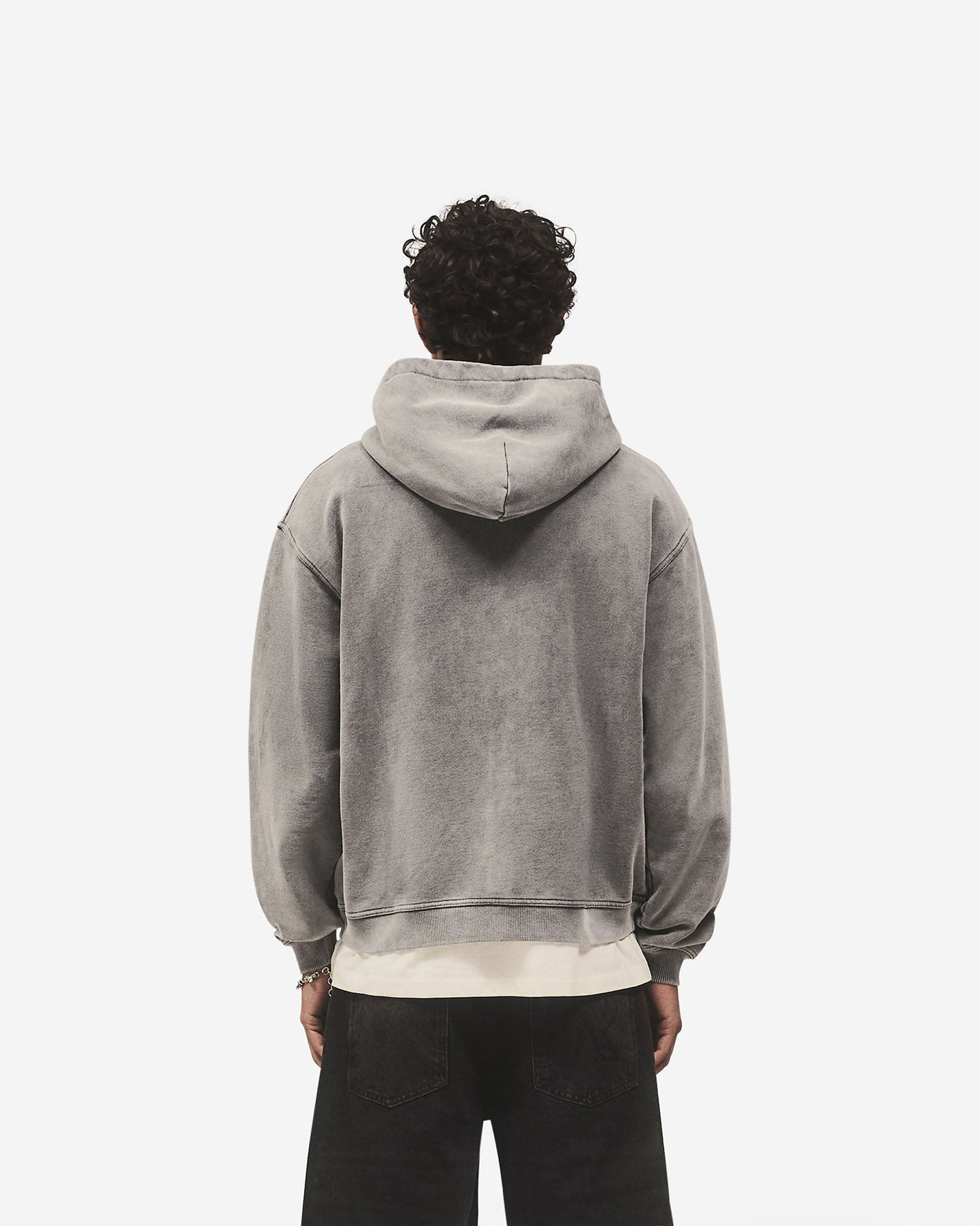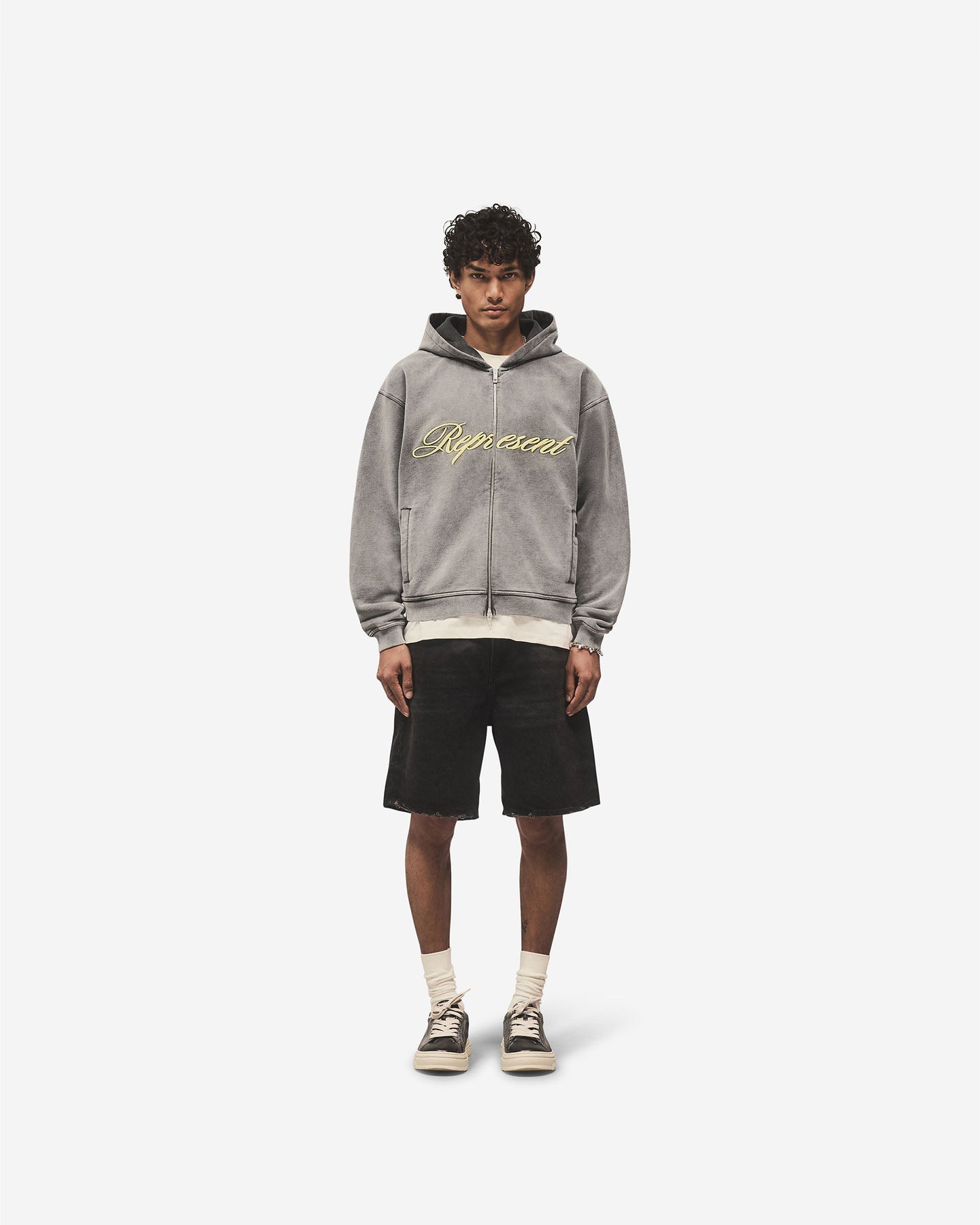 Introducing the Script Logo Zip Hoodie in Vintage Grey, a slightly oversized zip-through hoodie made from heavyweight jersey cotton with a washed finish. It features tonal high-build script embroidery to the front, a double-layered hood for added structure, and a double-ended RiRi zip. Finished with welt pockets and our signature Represent metal bar.