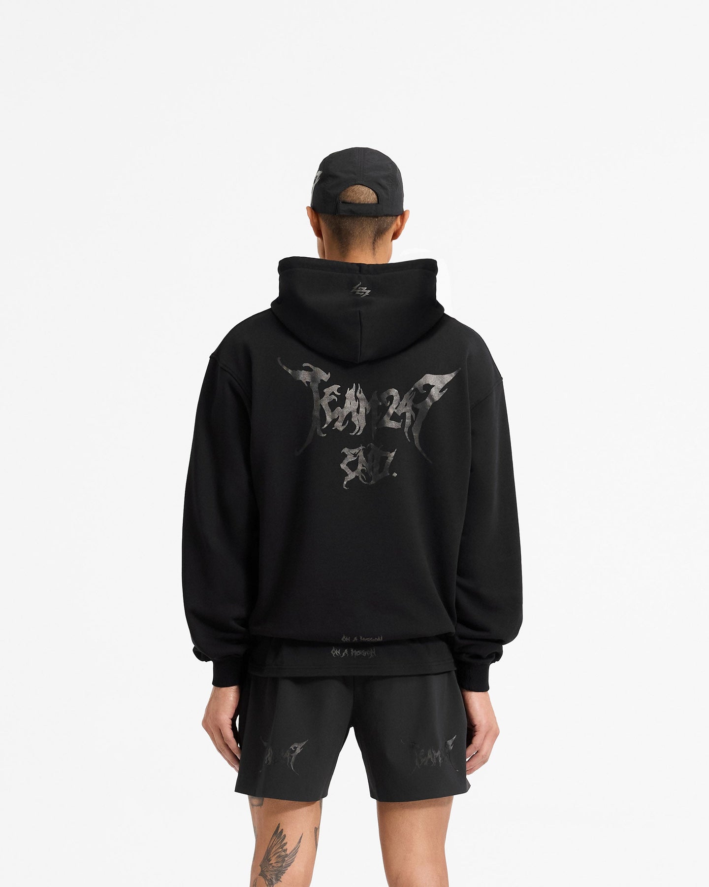 The hoodie features ribbed cuffs and hem for a secure fit, while the internal drawstring hood provides adjustable coverage. Signature to this END. collaboration, co-branded graphics sit on the left chest and back, with a 247 logo on the hood. The mantra ‘On a Mission’ is subtly printed at the back hem. Finished in black foil print on a black base.
