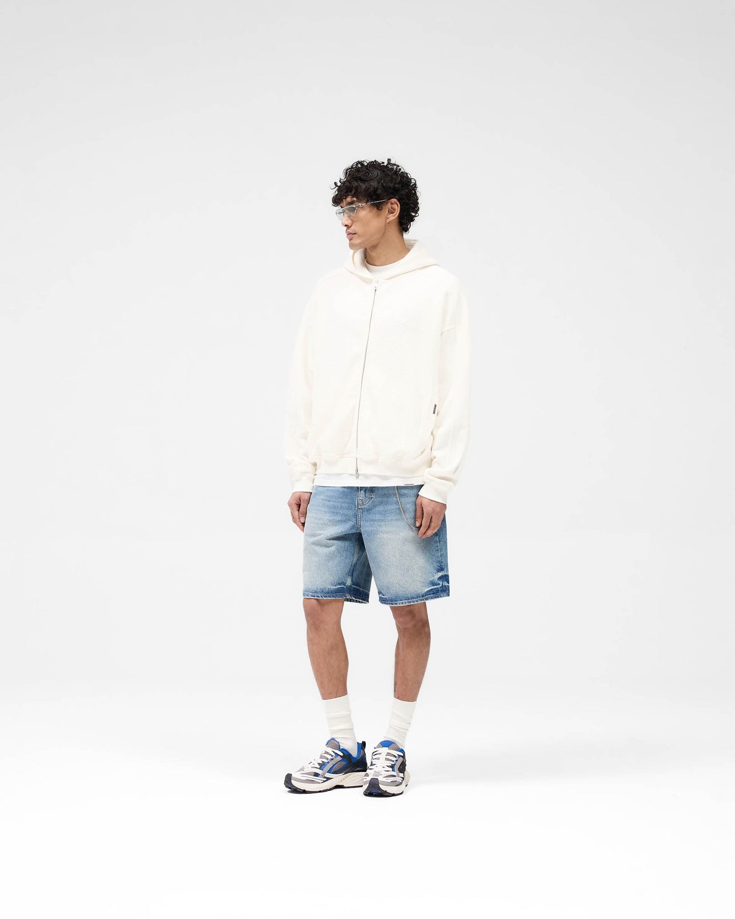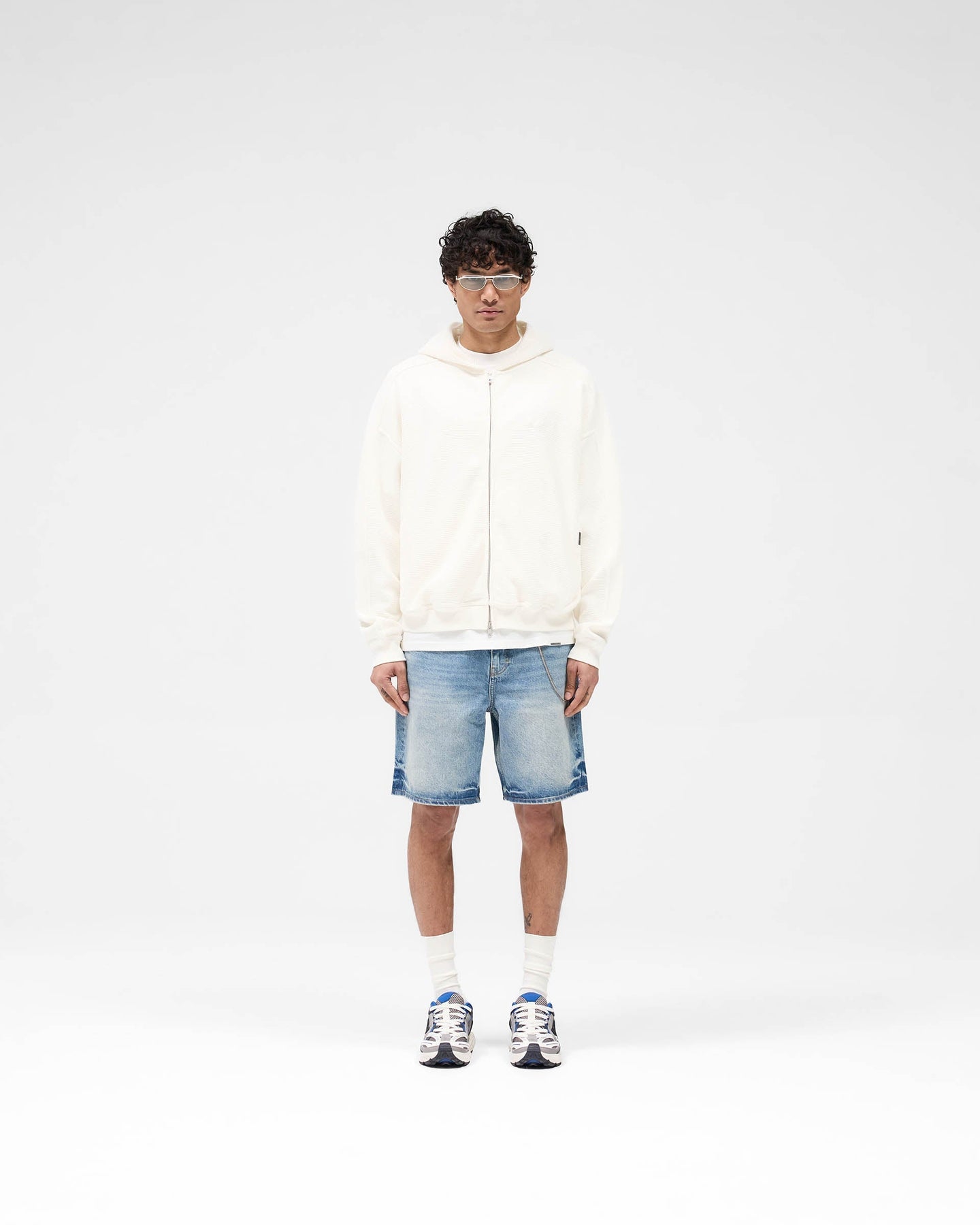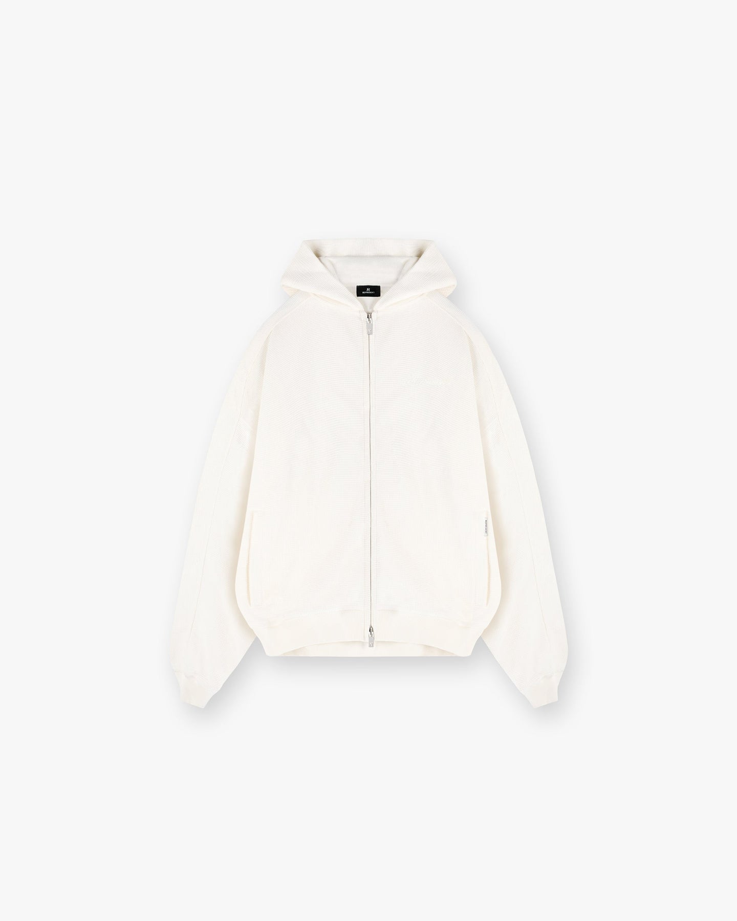 Introducing the Waffle Zip Through Hoodie in Flat White, featuring an oversized boxy fit that enhances its drapey silhouette. A chest embroidered Represent logo, branded double RiRi zipper.